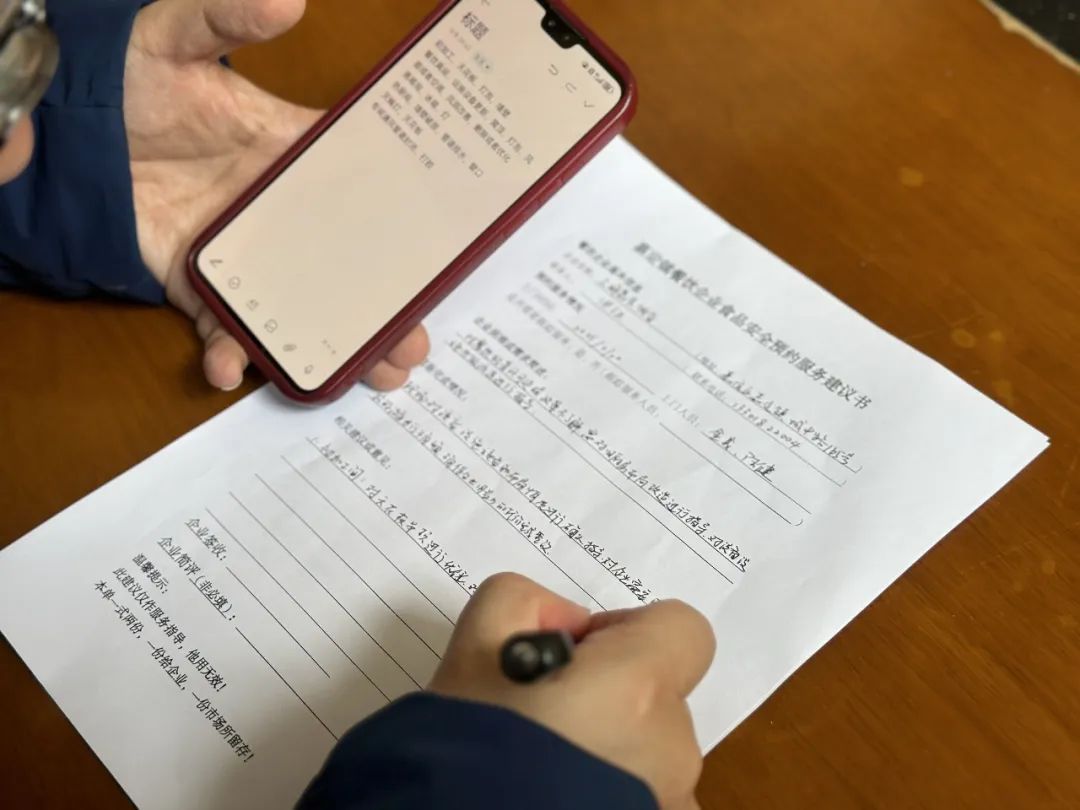 经过半个多小时的“体检”,执法人员在一份《餐饮企业食品安全预约服务建议书》上写下相关建议,建议饭店抓紧在经营淡季装修整改,并可以随时联系相关片区工作人员跟进指导。