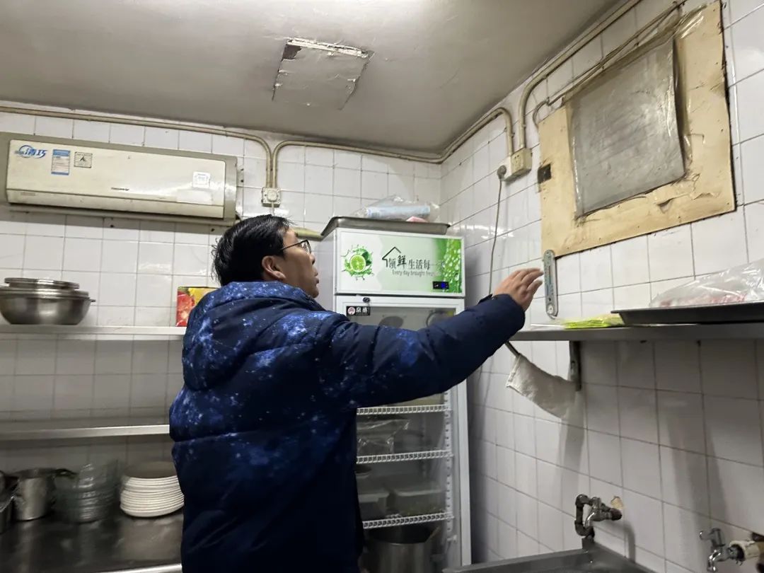 现场,执法人员到达饭店厨房,发现厨房整体布局划分清晰,主要问题还是设施设备的老旧和破损。“粗加工间的天花板吊顶破旧且难以清洗,需要重新装修。”嘉定镇市场监管所副所长金晟补充道,“这些旧式的日光灯、防爆灯,量少且整体照明不足,导致厨房加工场所照明度不够,工作人员不能及时发现菜虫等不可食用的异物,容易引发食品安全问题,所以要把照明灯具进行升级。”