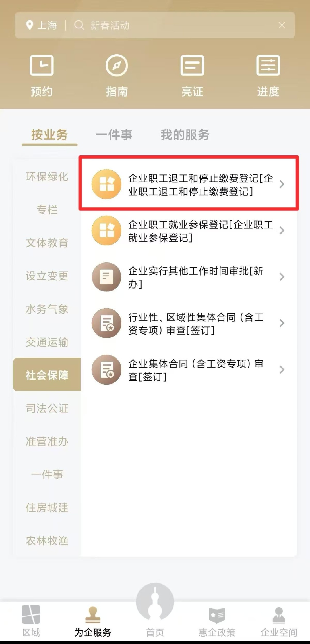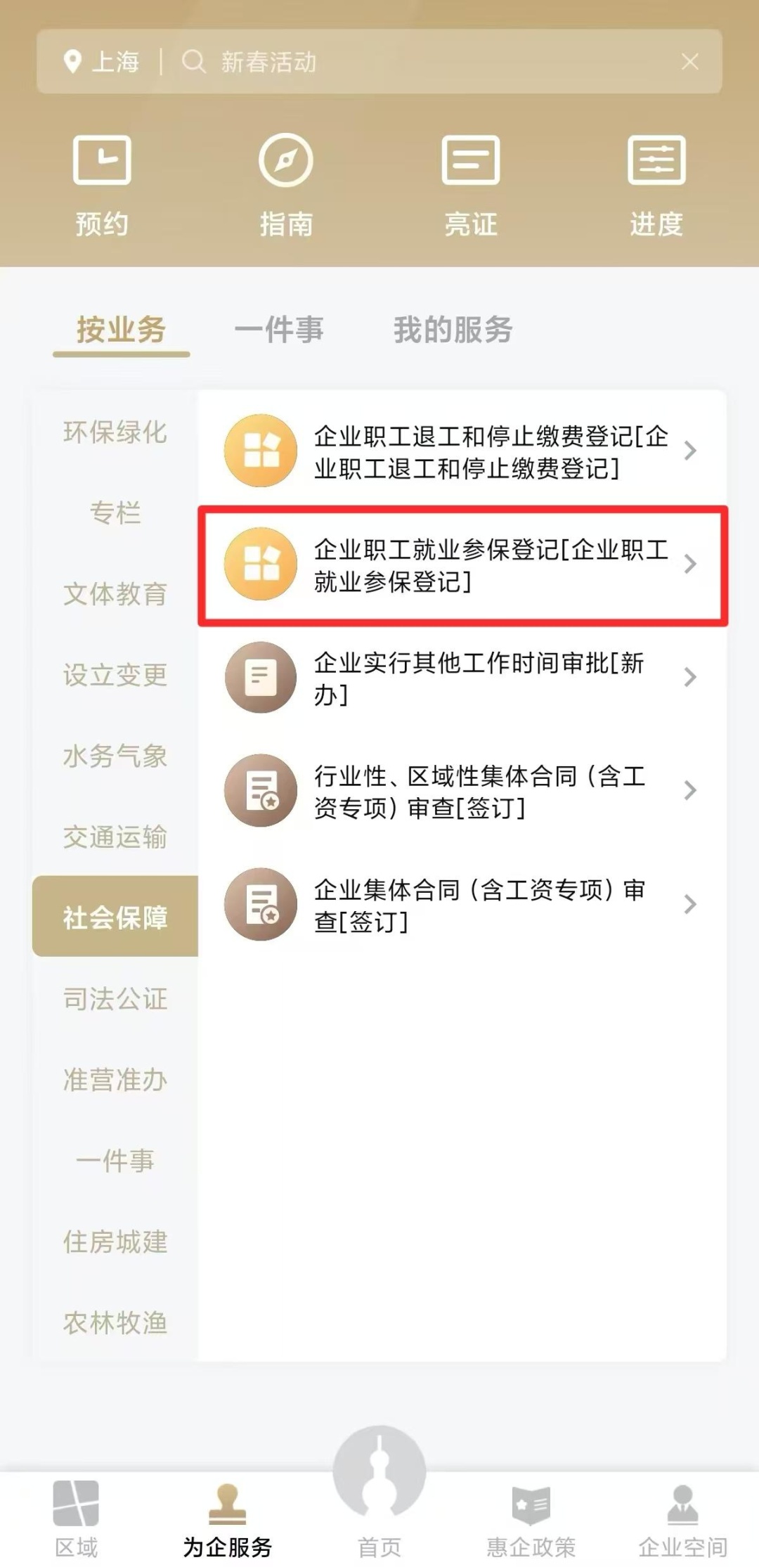 先点击左侧【社会保障】,再点击右侧【企业职工就业参保登记[企业职工就业参保登记]】。