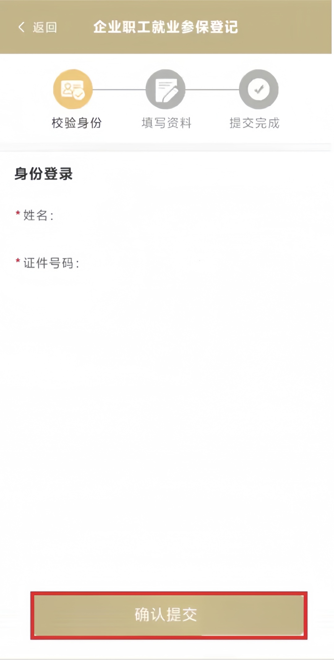 进入“校验身份”页面,分别填写职工的“姓名”“证件号码”,核对无误后点击【确认提交】。