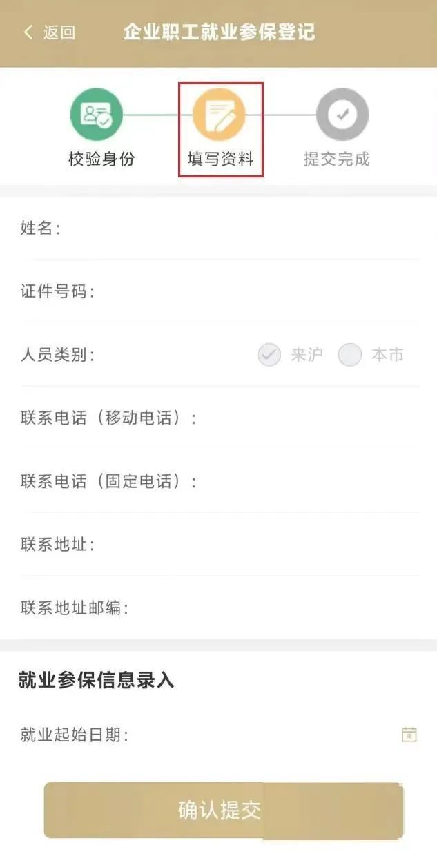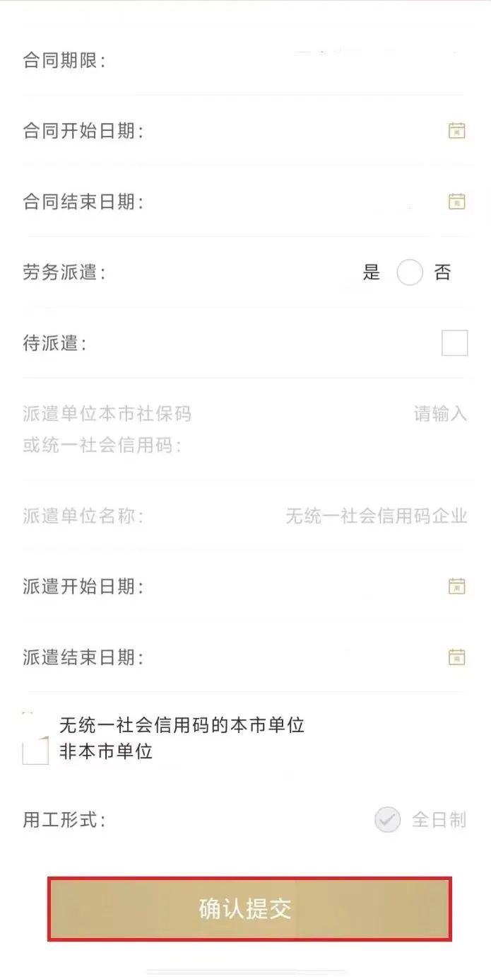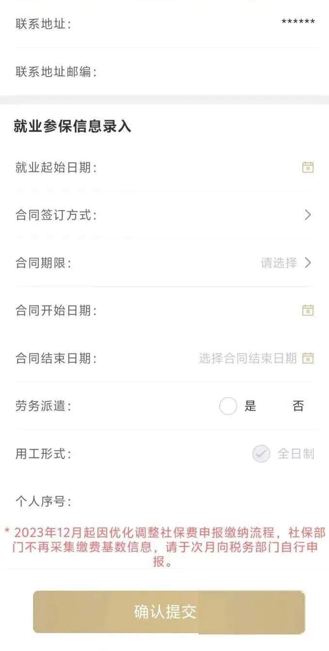 进入到“填写资料”页面,在“就业参保信息录入”栏目进行相关项目申报。其中“就业起始日期”“合同开始日期”默认申请当日,可修改;“用工形式”默认“全日制”,线上申请不可修改;其他项目根据实际情况进行选择。各项申报信息核对无误后,点击【确认提交】。