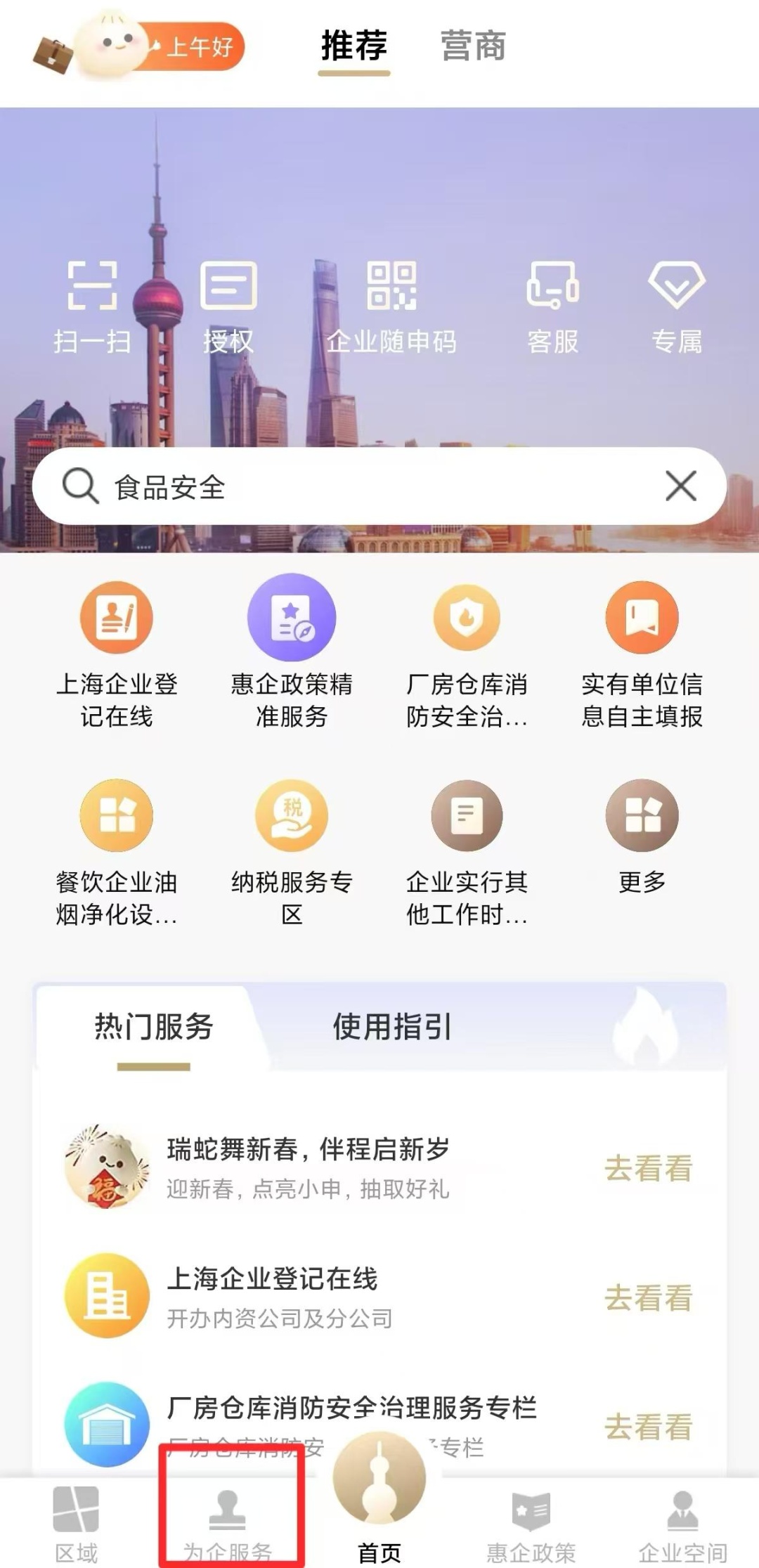 企业用户先登录“随申办企业云”APP,点击手机屏幕左下角【为企服务】。