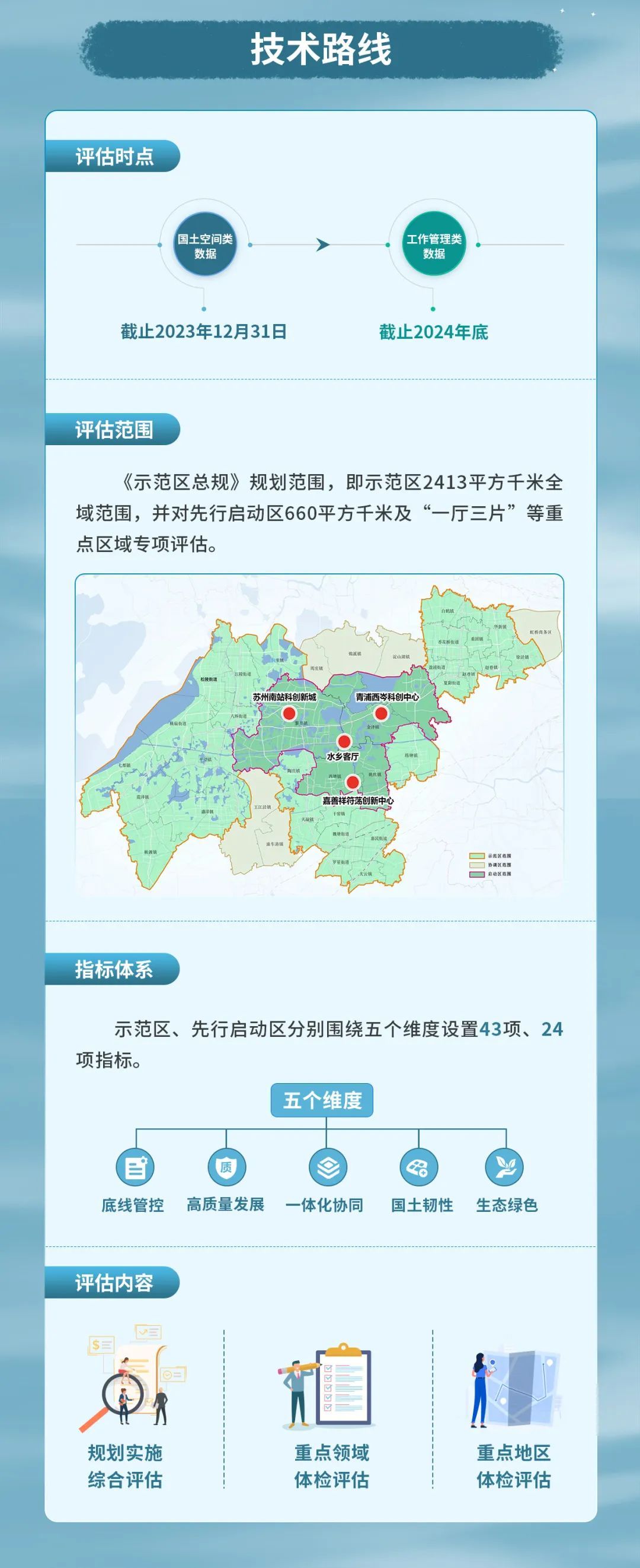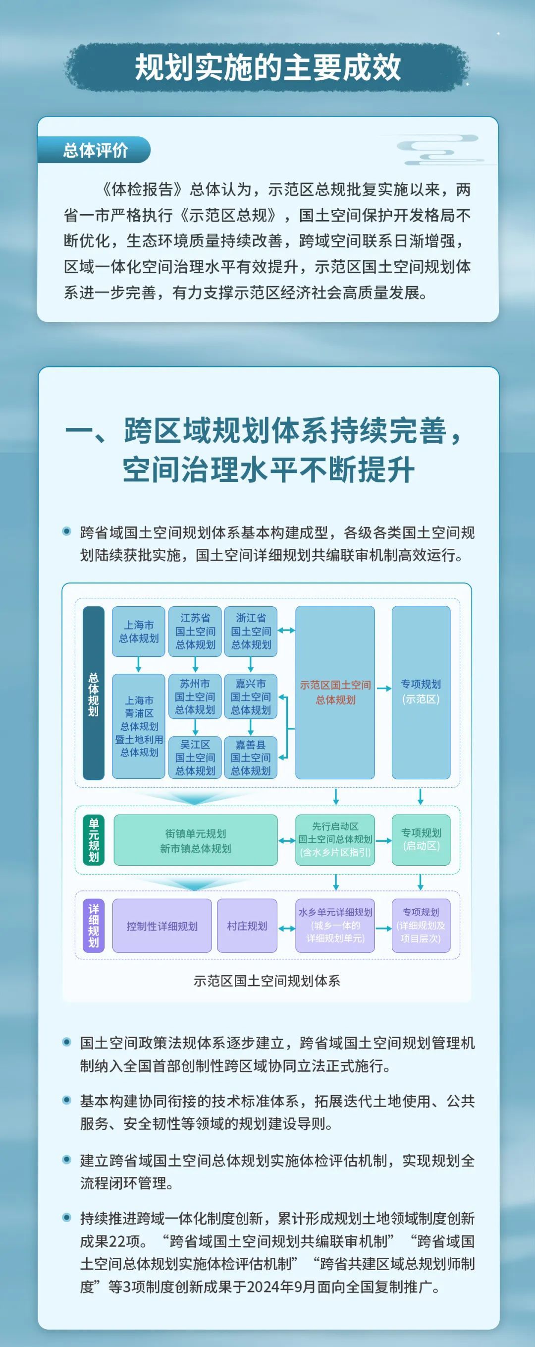 推进示范区总规实施体检评估是完善示范区国土空间规划体系、提升国土空间治理现代化水平的重要举措。2023年2月示范区总规获批后,在自然资源部指导下,示范区建立了“一年一体检、五年一评估、重点领域专项评估”实施监测机制,按期编制实施体检评估报告,实现规划实时监测、动态维护,保障“一张蓝图干到底”。