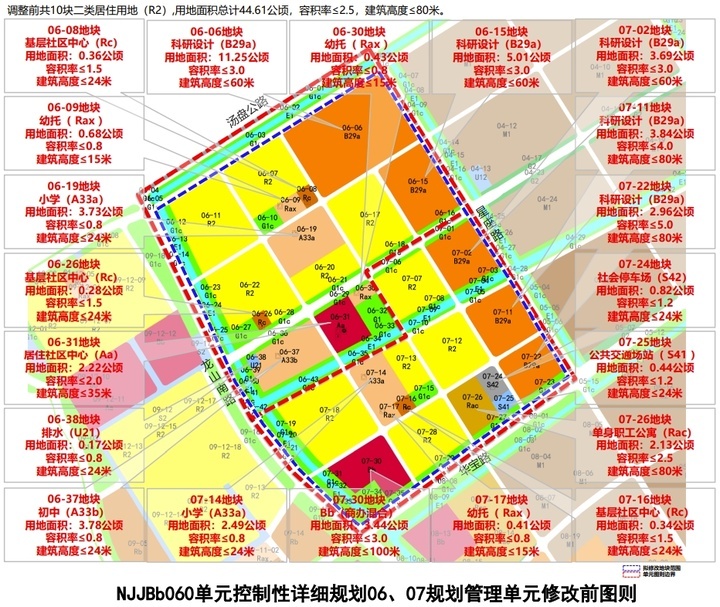 拟修改区域现状以空地为主,其中包含此前拟定的10块二类居住用地,这些地块用地面积总计44.61公顷,容积率≤2.5,建筑高度≤80米,调整后容积率≤2.5,建筑高度≤60米。
