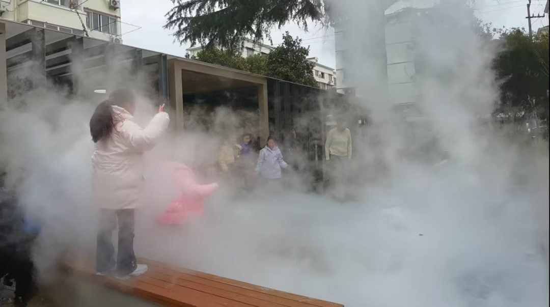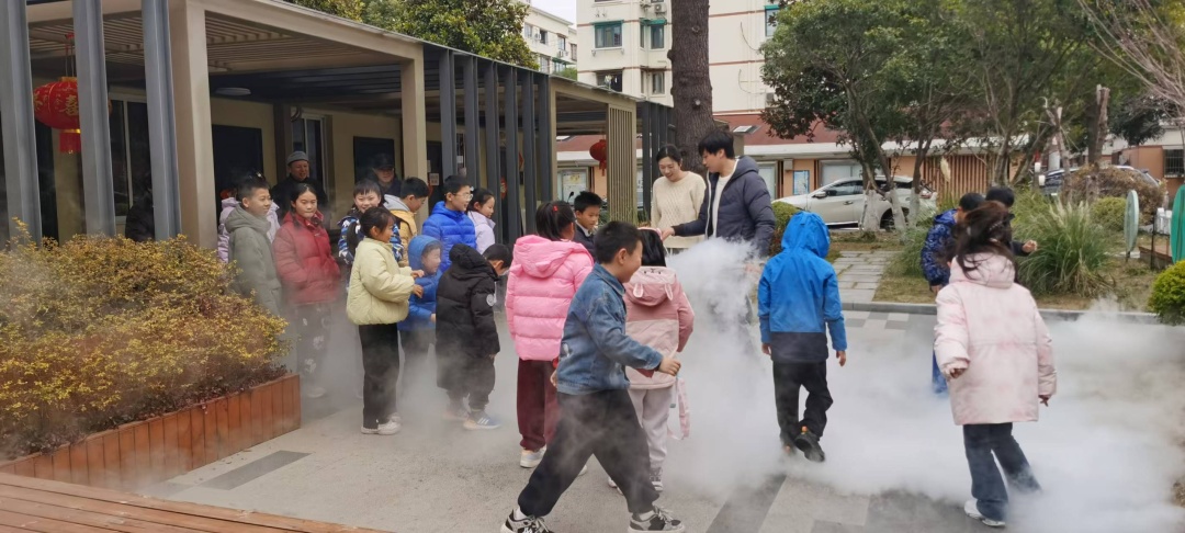 社区花园里仙气飘飘,远远望去犹如腾云驾雾一般,孩子们聚在一起欢呼雀跃,居民们也不禁前往一探究竟。原来,是徐汇区虹梅街道古二居民区妇联正在举办科学实验秀活动,激发孩子们探索科学的热情。
