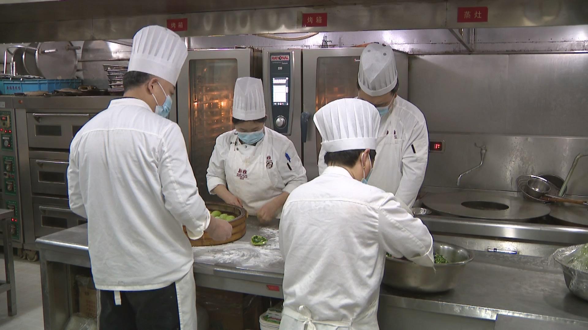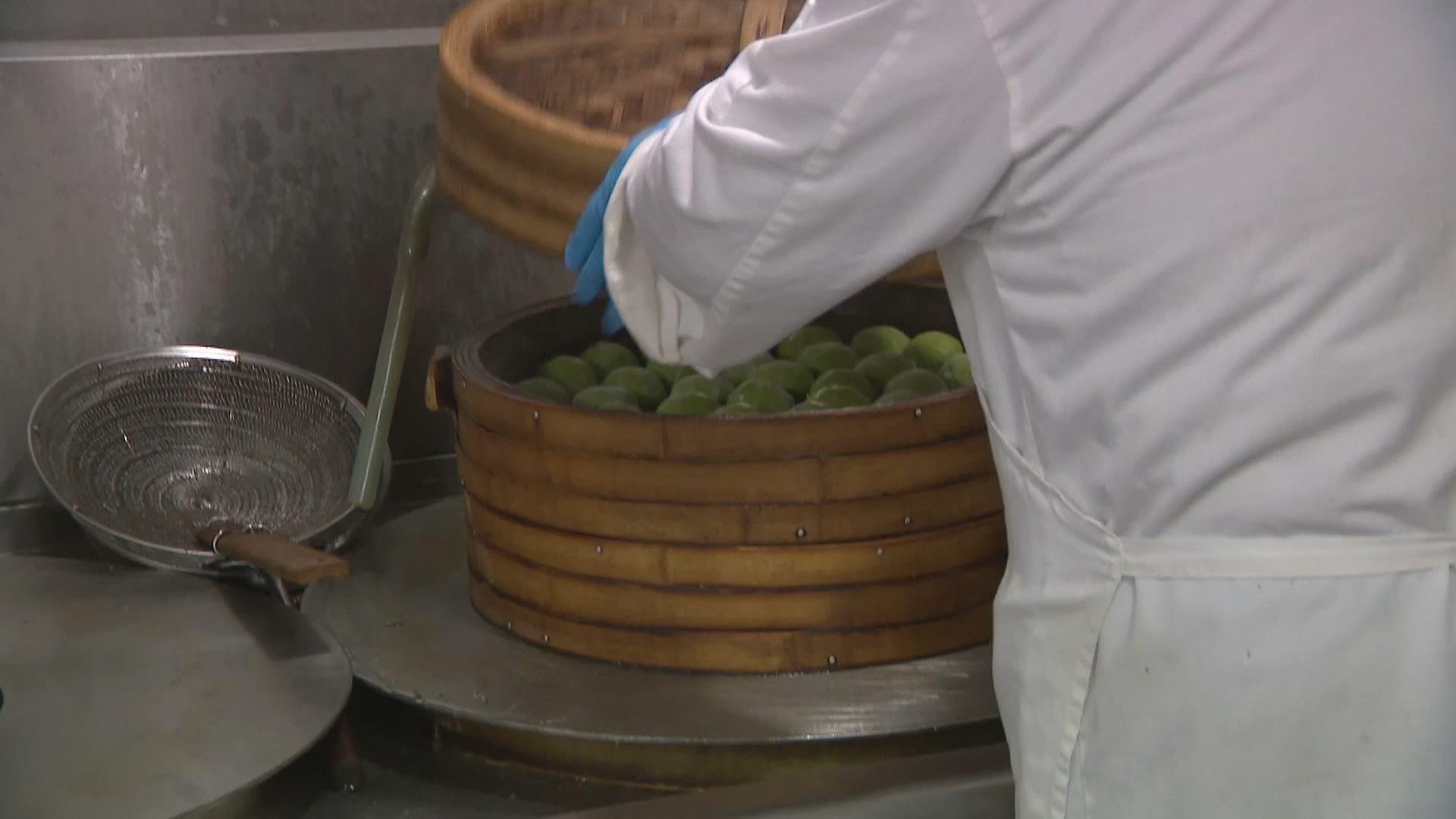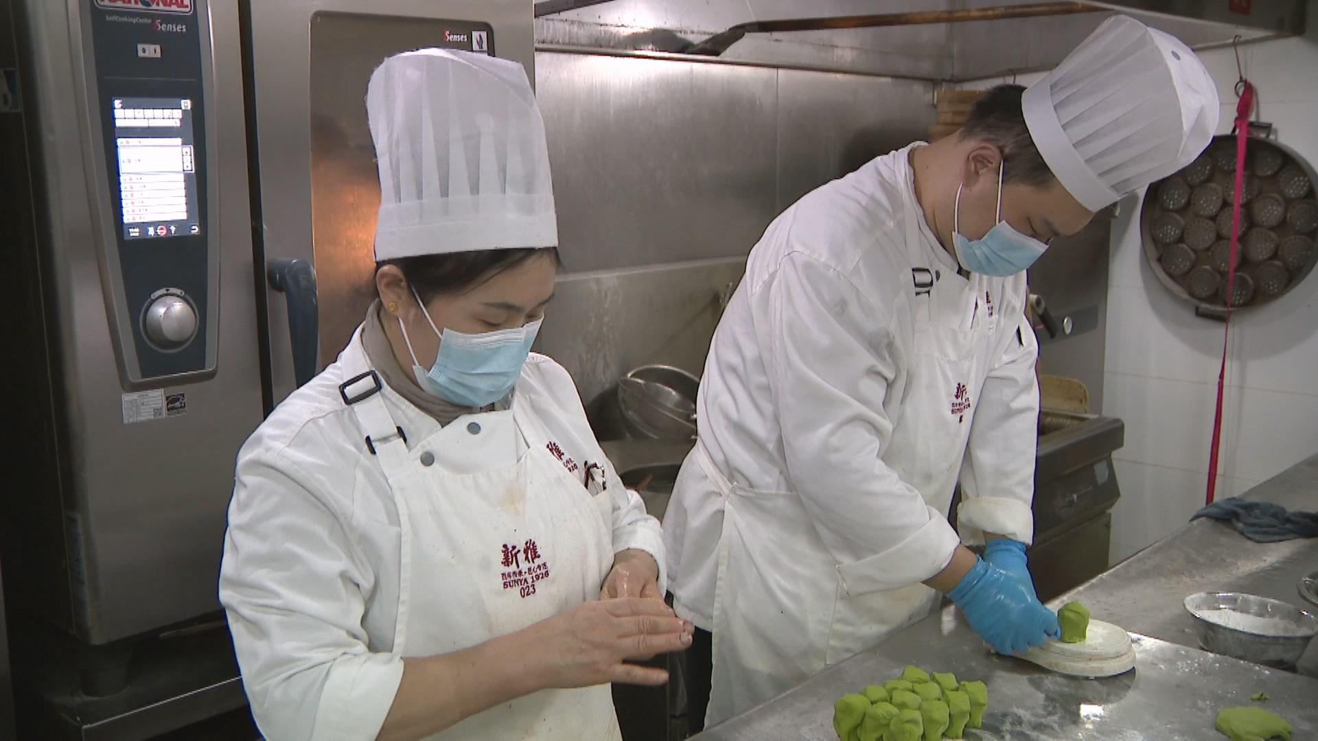 在点心操作间里,点心师傅们正在忙着包制青团,每只青团的皮胚和馅心都要经过称重,确保每只青团都能足够分量。今年新雅在正月十五后就已经推出了青团,共有8个品种,除了传统经典的腌笃鲜青团、陈皮豆沙青团、纯蟹粉青团等之外,还推出了芝士芋泥青团。新雅行政总厨黄任康告诉记者:“现在市场上芋泥比较流行,在不少点心中都有用到。我们把马苏里拉芝士拌在芋泥中,效果比较好,芋泥的清香,马苏里拉的奶香味都相当浓郁。而且刚出笼的青团还会拉丝。”