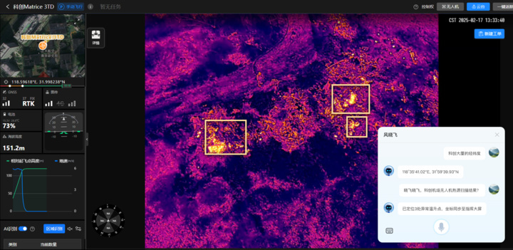 在消防领域,消防员呼叫:“晓飞,报告2号无人机热源扫描结果。” 风晓飞回复:“已定位3处异常温升点,坐标同步至指挥大屏。”在广袤的山林里,生态巡护员发出语音指令:“着火点A的经纬度是多少?” 风晓飞:“经纬度各是……”