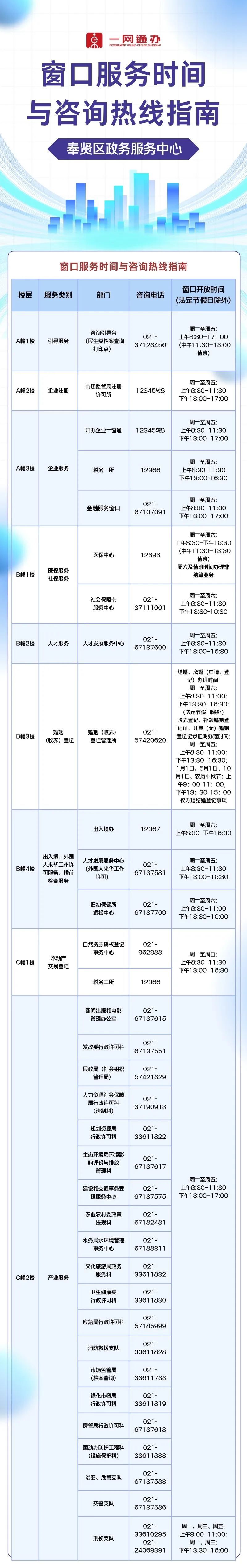 您的时间很宝贵,我们的服务不掉线!点击保存这份“窗口服务时间表”,提前规划不白跑。奉贤区政务服务中心始终以精准、专业、暖心的服务,助您省时省力办成事。阳光服务,准时相约,我们在大厅等您来“打卡”!