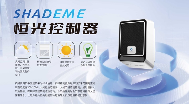 一种贴在窗玻璃上、手掌大小的盒子——全天候恒光器,集成了仿人眼相机模块和高精度光线追踪技术,可方便精准控制卷帘、百叶窗等多种遮阳装置,阻挡过多的阳光直射,保证室内光线充足不刺眼,既节省照明能耗,也有效降低制冷、制热能耗。