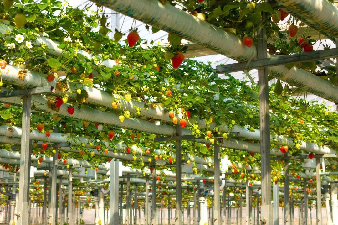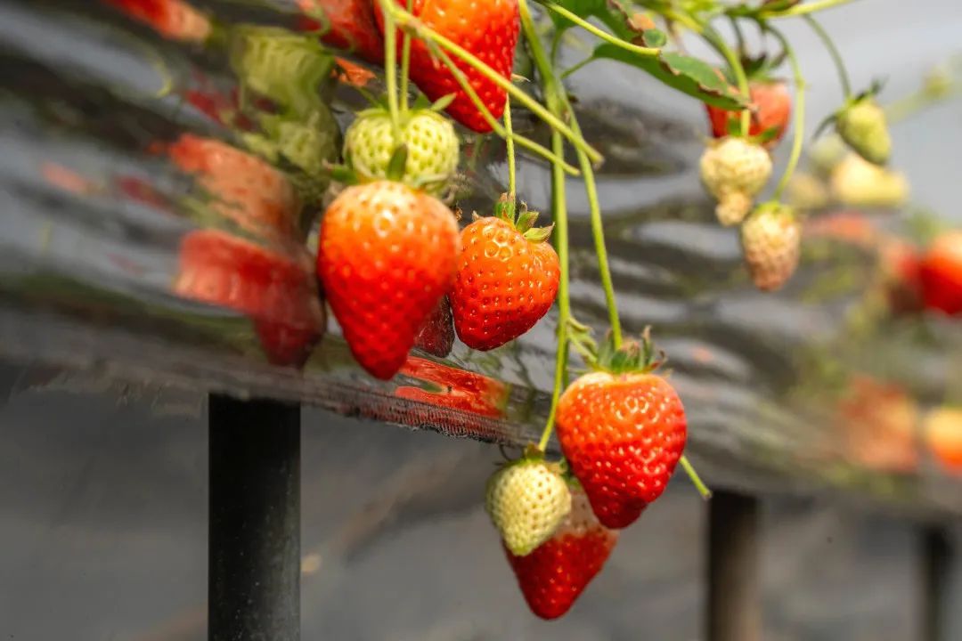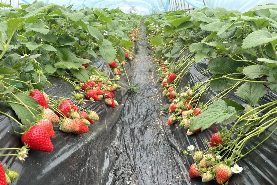 突破传统、不断创新的特点同样体现在草莓的栽培方式和生产管理中。除了传统的露天和大棚地栽方式,连栋大棚内的立架栽培打破了平面的限制,将草莓种植在层层叠叠的架子上,充分利用空间,让草莓像是住进了“立体公寓”,不仅增加了种植密度,还让采摘变得更加便捷,同时也为草莓园增添了独特的景观。