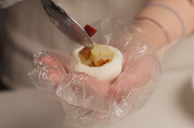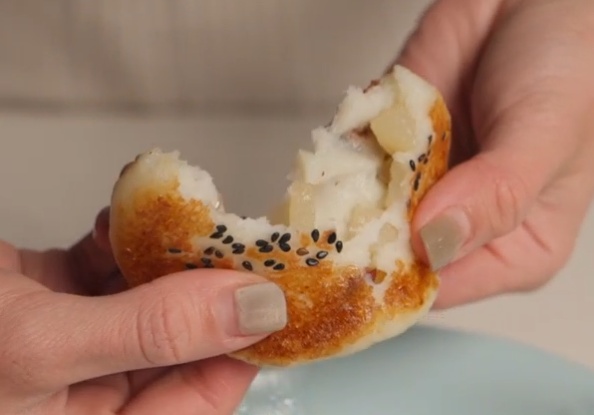 5.将面团搓成小球,加入馅料,面团表面点缀黑芝麻。