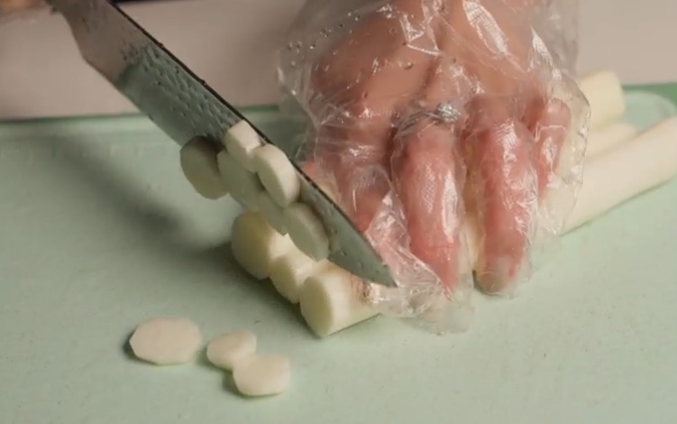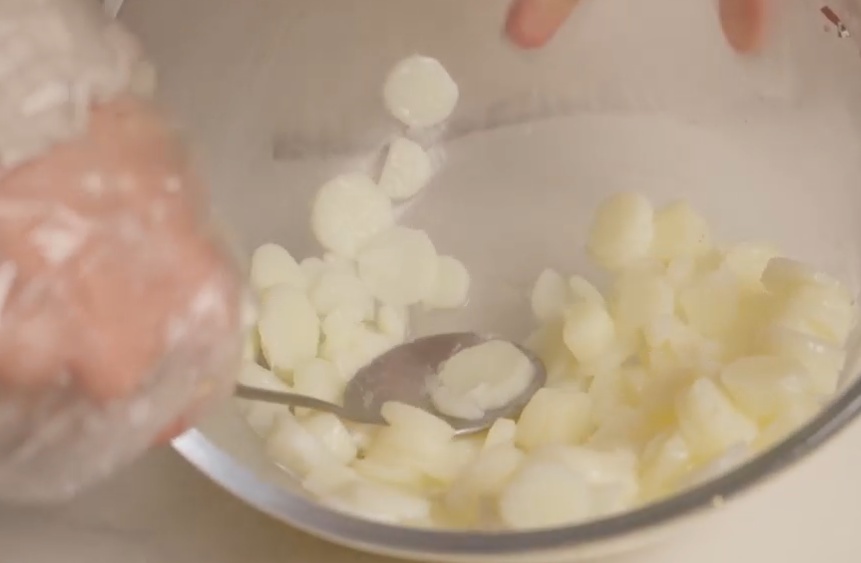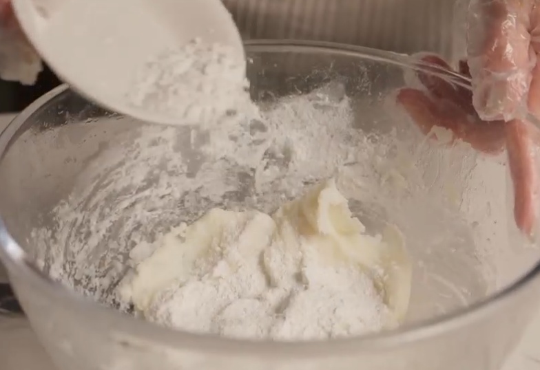 4.将蒸熟的山药捣成泥,少量多次加入糯米粉,将面团揉匀。