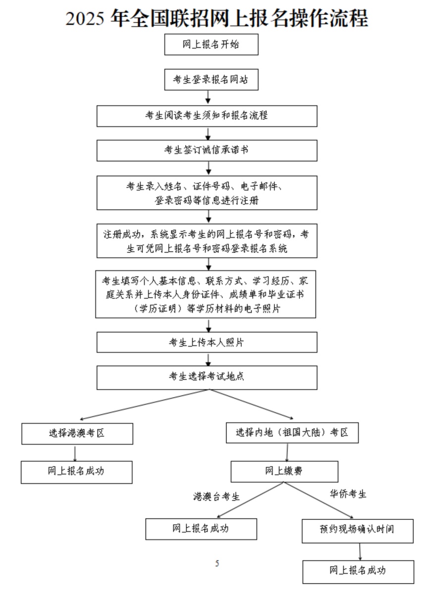 所有考生均须在上述规定时间内登录系统,按要求进行注册,输入报考信息,上传本人照片、身份证件及学历资料电子照片,选择考试地点。考试地点一旦提交,包括但不限于个人信息、考试地点等内容,均不得再进行修改。内地考点考生还须完成网上缴费,华侨考生须预约现场报名确认的时间,逾期不再受理。网上报名成功后,报名状态显示为“待确认”。网上报名流程详见下方。