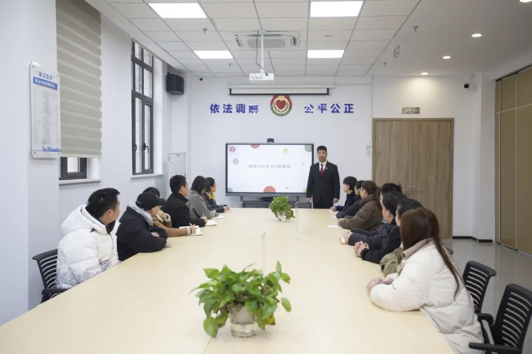 “今天我们的讲课围绕大家最熟悉的继承纠纷展开。”奉贤区人民法院立案庭法官助理李晓东以《继承纠纷常见问题解读》为题,为金海街道综治中心的人民调解员及其他工作人员授课,聚焦继承法律规定,结合案例深入浅出地讲解继承顺序、继承人的确定、遗产分配原则、各类遗嘱订立的注意要点等事项,并解答个性化问题。
