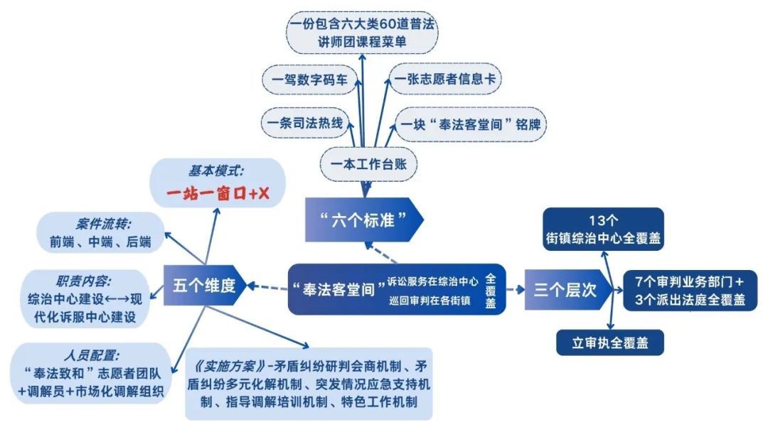 这是奉贤区人民法院继“奉法客堂间”入驻生活驿站、“无讼村”、数字“码”车( 点击查看详情)后所探索推出的“奉法客堂间”4.0版本,旨在深入落实上海市高级人民法院党组“诉讼服务在综治中心全覆盖,巡回审判在各街镇全覆盖”工作要求,通过“1+1+X”的一站、一窗口、一特色的运行模式,依托“奉法致和”志愿者、调解员、民非调解组织三支队伍,积极推进矛盾纠纷源头实质性化解,为激活基层社会治理新动能贡献“奉法智慧”。