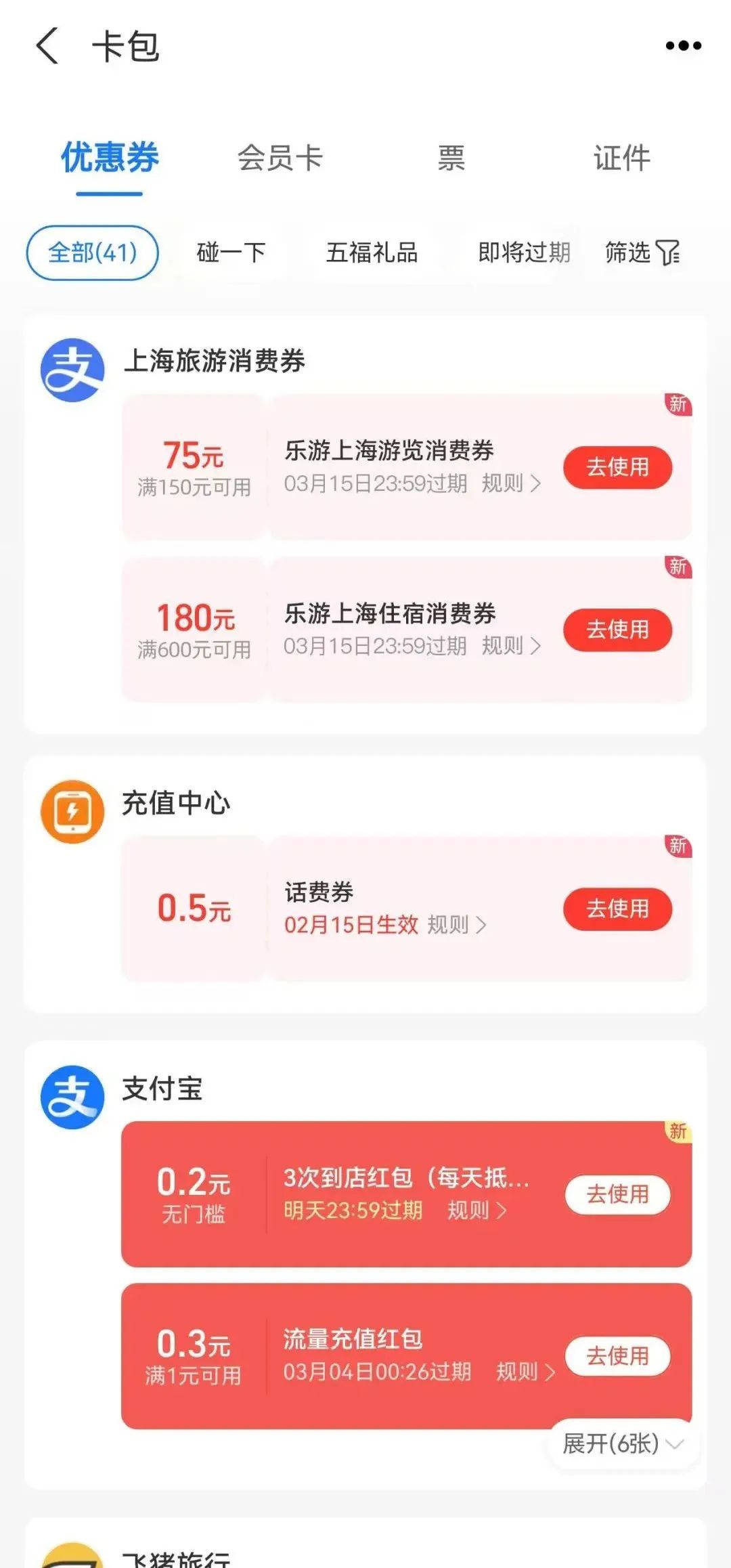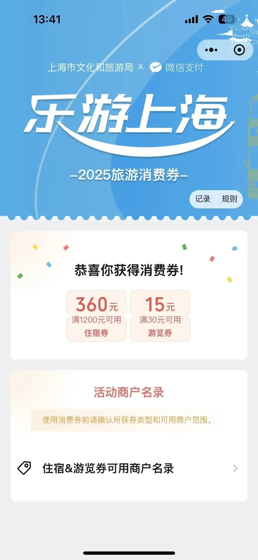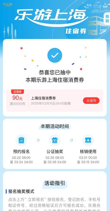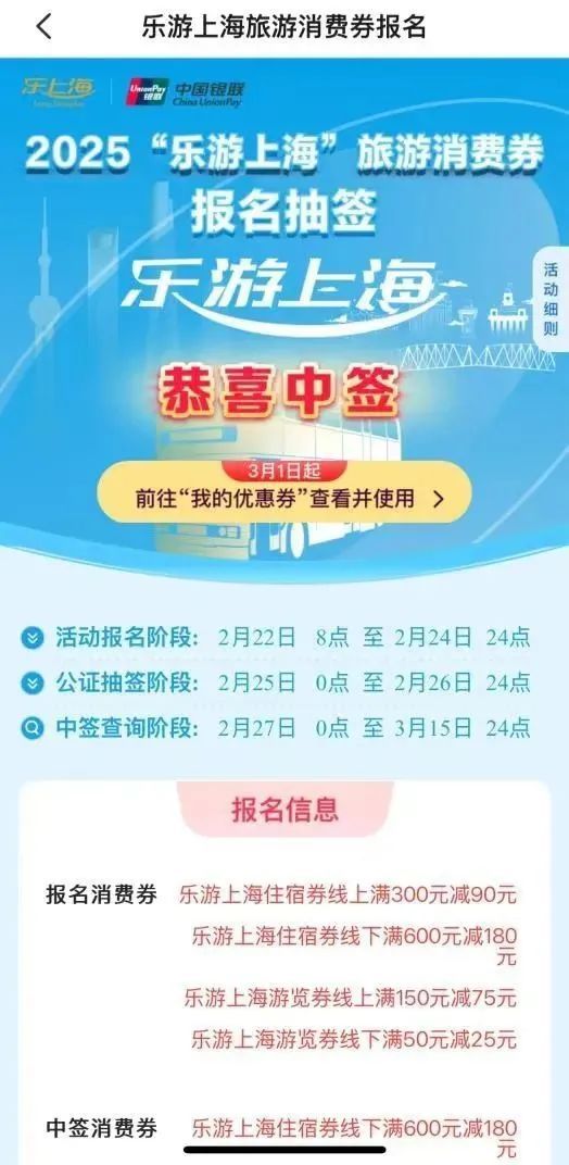 “乐品上海”餐饮消费券、“乐游上海”旅游消费券的第一阶段消费者摇号中签结果已发布。消费者于今日(2月27日)可以查询。 第一轮餐饮消费券共计84.4万张,截至2月24日24点,银联云闪付、支付宝和微信支付三个消费券发放平台报名的消费者合计463.5万人次。 银联云闪付方面:满300元减90券报名人数37.0万人,满500元减180券报名人数27.2万人,满1000元减400券报名人数21.4万人。三种消费券中签率分别为:43.2%、29.4%和22.4%。 支付宝方面:满300元减90券报名人数72.5万人,满500元减180券报名人数51.7万人,满1000元减400券报名人数35.7万人。三种消费券中签率分别为:22.1%、15.5%和13.4%。 微信支付方面:满300元减90券报名人数100万人,满500元减180券报名人数68.2万人,满1000元减400券报名人数49.9万人,三种消费券中签率分别为:16%、11.7%和9.6%。 消费券将于2月28日(周五)24:00前存入相应的平台APP或小程序账户中,3月1日起可以使用,有效期截止到3月31日。 摇号结果查询方式 2月27日起,消费者可以通过报名原路径查询摇号结果。消费券将于3月1日00:00前经平台配券核对后存入中签消费者报名时使用的账户。 银联云闪付:云闪付APP首页搜索“乐游上海”,或点击首页「本地精彩」-「乐游上海」专区,进入活动页面查询摇号结果。3月1日起,中签消费者可前往云闪付APP「我的」-「优惠券」界面查看并使用消费券。 支付宝:支付宝APP首页搜索“乐游上海”,或点击「出行」-「出去玩」/「酒店」界面,找到对应入口进入活动页面,查询摇号结果。3月1日起,中签消费者可前往支付宝APP首页「卡包」-「优惠券」界面查看并用券。 微信:微信APP搜索“乐游上海旅游消费券”,点击进入微信小程序,查询摇号结果。消费券发放至中签消费者的微信卡包时,会同步发送微信通知。3月1日起,中签消费者可前往微信APP「我」-「卡包」-「券和礼品卡」界面查看并用券。 超多商户参与,热门场景全覆盖 据悉,全市超3500家商户踊跃参与此次旅游消费券活动,参与酒店覆盖上海两座机场、重点旅游度假区、热门演艺场所等。九成以上的上海4A、5A级旅游景区,以及迪士尼、欢乐谷、海昌海洋公园等主题乐园也纷纷加入,观光巴士、黄浦江游览、苏州河游览等商户更是全部参与,满足市民游客不同类型的需求。