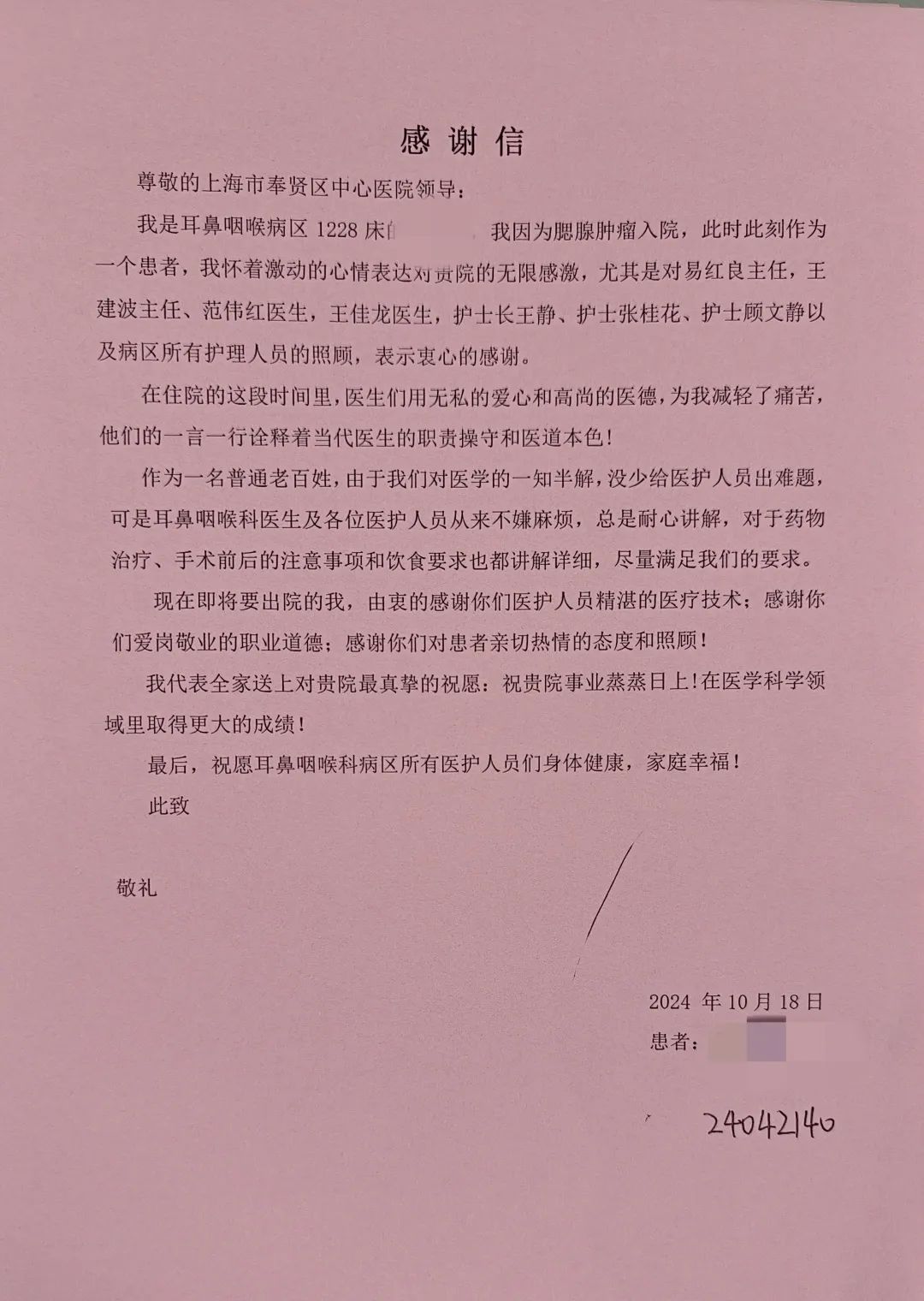 自2024年8月受聘担任区中心医院耳鼻咽喉科学科带头人以来,易红良主任以精湛的医术和严谨的态度,带领团队成功救治了许多像小蔡一样的患者,为他们解除了病痛,点燃了生命的希望。他的专业与奉献不仅让患者重获健康,也赢得了患者及家属的由衷赞誉与感激。