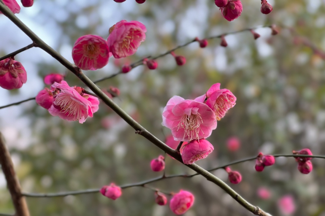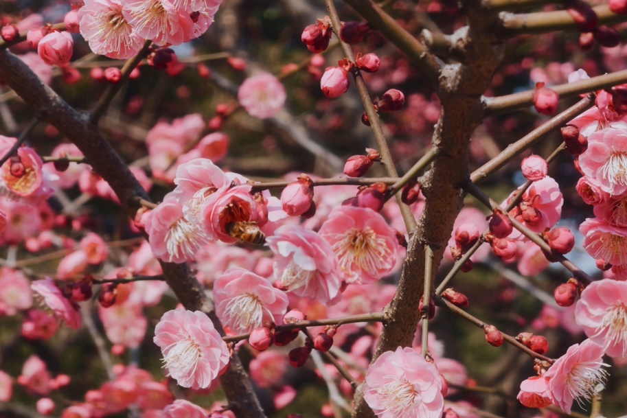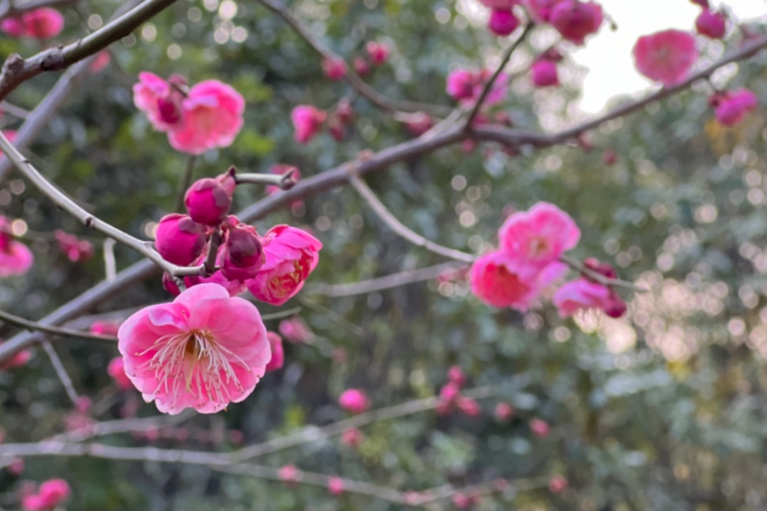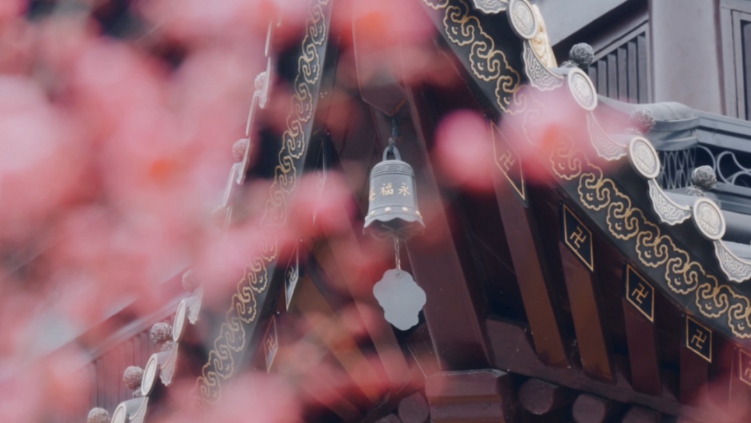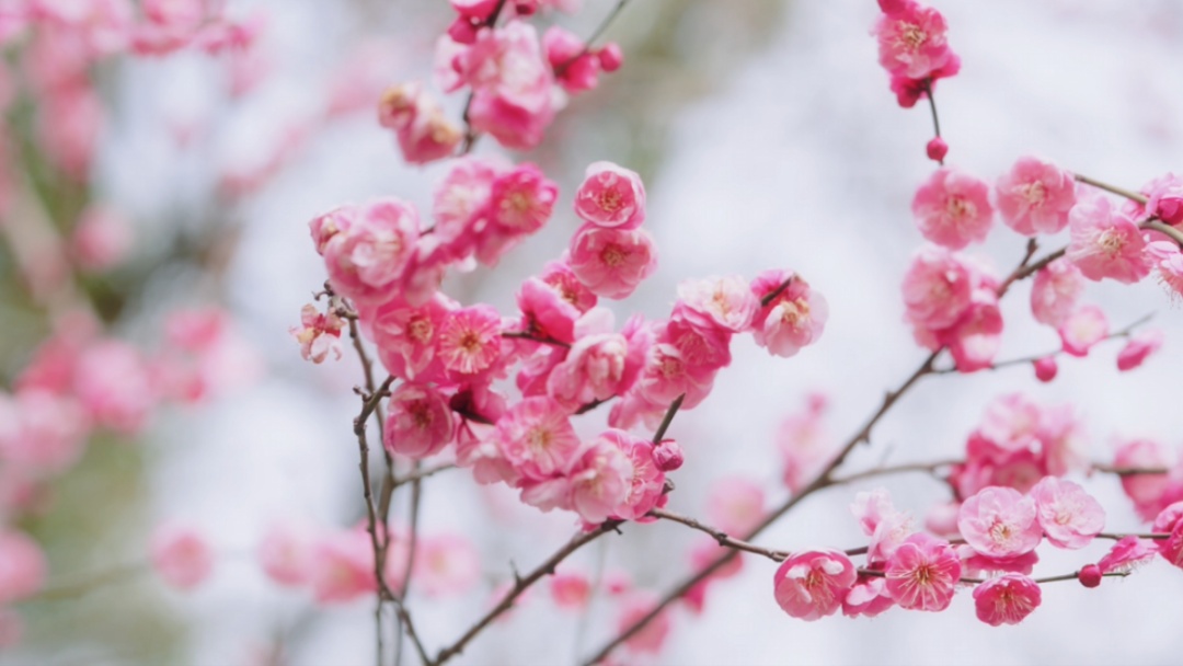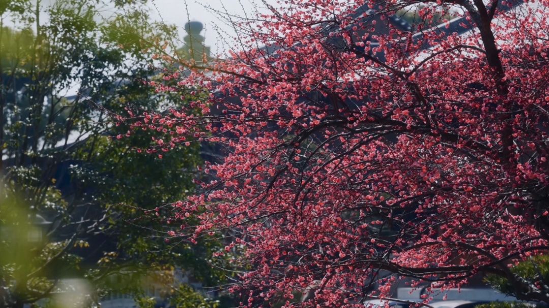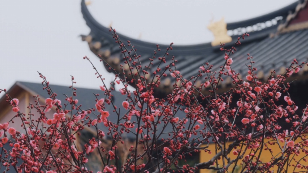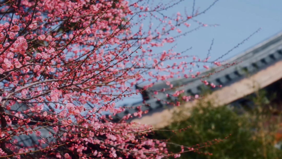 梅花与庙宇楼阁相映成趣,每一朵梅花都像是大自然精心雕琢的艺术品,粉得恰到好处,以端庄大方的姿态,迎接春天的到来。