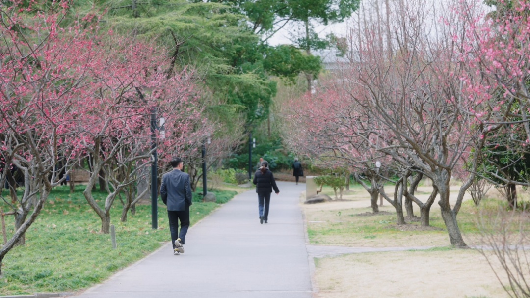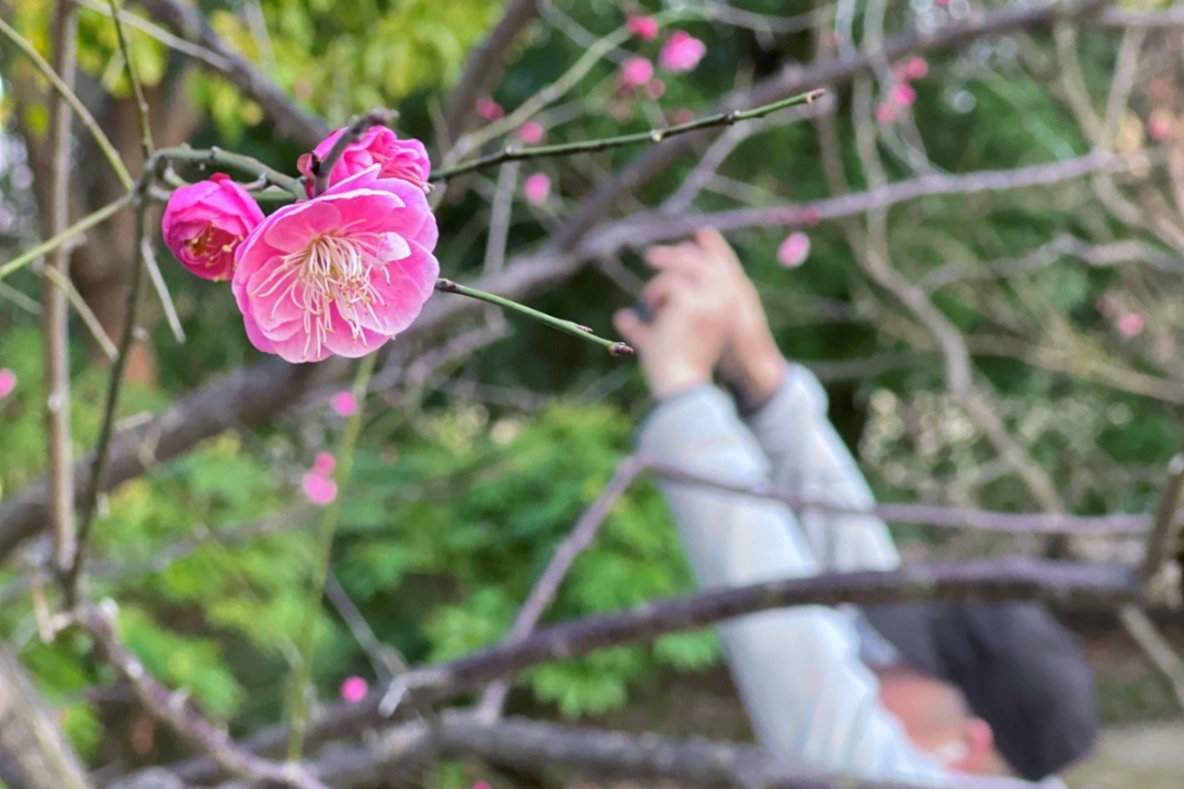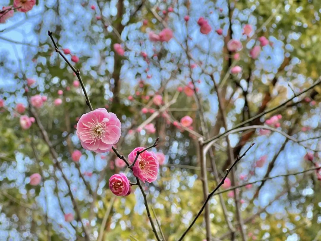 在友谊公园,大片的梅花在暖阳的轻抚下,毫无保留地舒展着身姿。远远望去,这片梅林宛如天边飘落的粉色云霞,仿佛将人带入了一个浪漫的仙境。