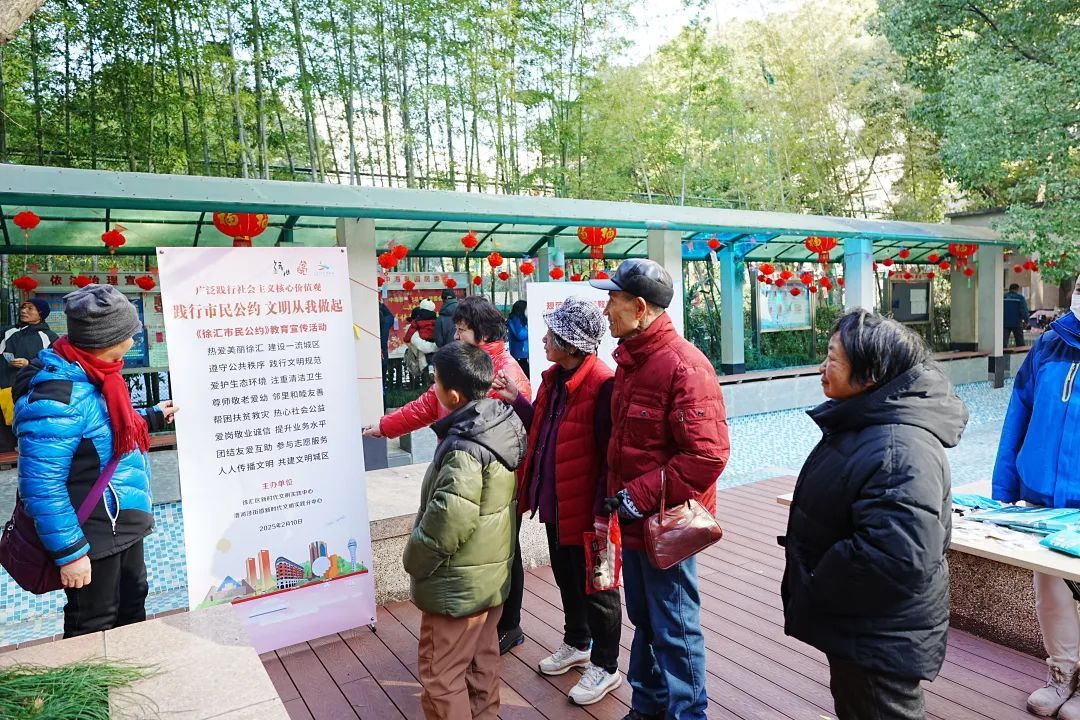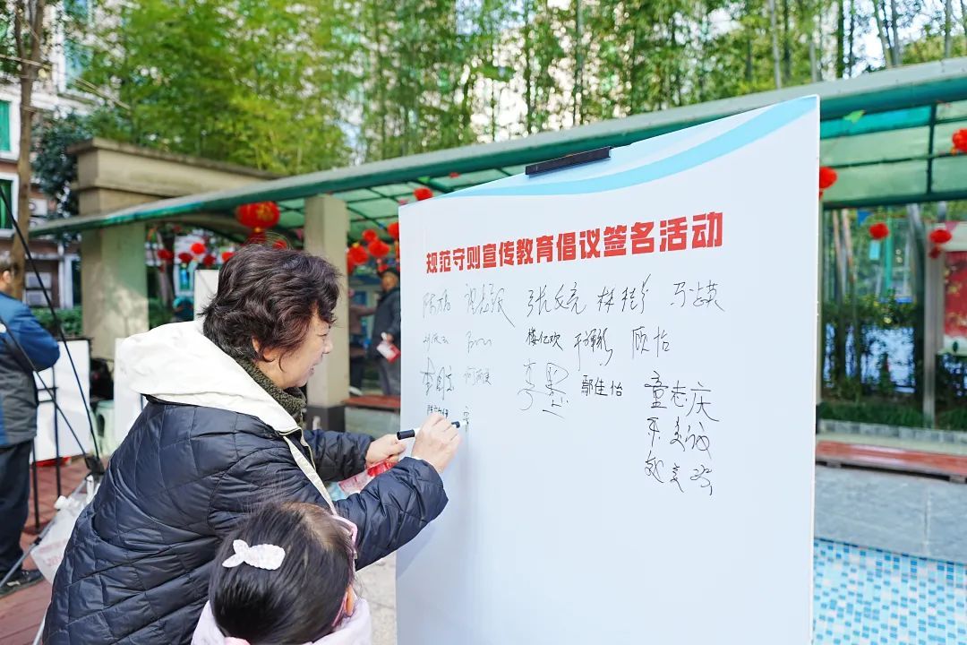 与此同时,漕河泾街道为进一步培育和践行社会主义核心价值观,提升辖区市民文明素养,举办了“践行市民公约 文明从我做起”规范守则宣传教育倡议签名活动。活动现场,工作人员通过摆放宣传展板、发放宣传资料等方式,向居民详细解读徐汇市民公约。公约涵盖遵守公共秩序、爱护环境卫生、爱岗敬业诚信等多个方面,让居民们对文明行为的标准有了更清晰的认识。居民们积极响应活动倡议,纷纷在签名墙上郑重写下自己的名字,以实际行动表达践行文明的坚定决心。