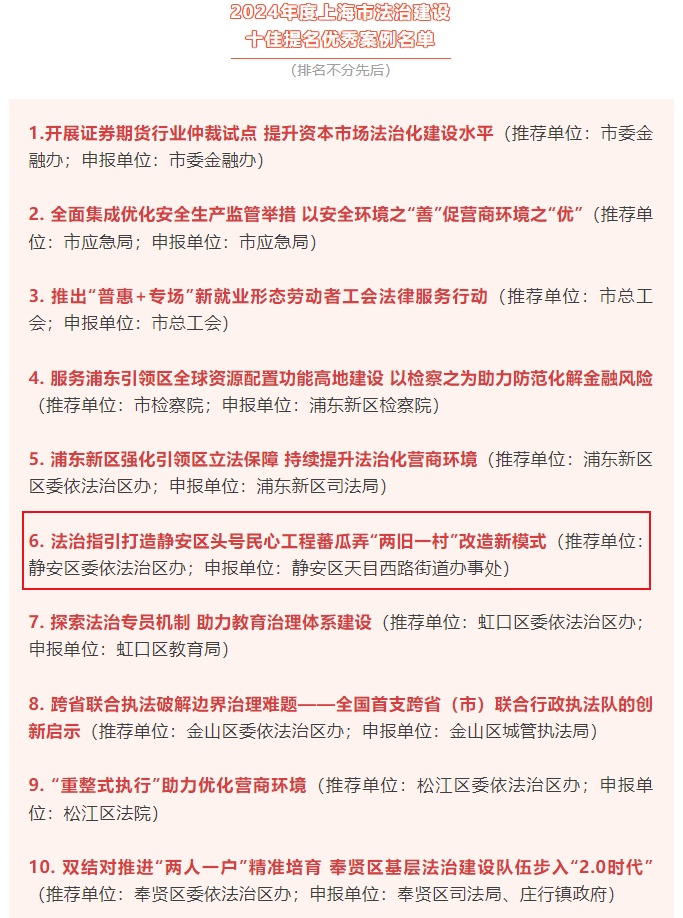 近日,2024年度上海市法治建设优秀案例征评结果出炉。静安区委依法治区办推荐、天目西路街道申报的《法治指引打造静安区头号民心工程蕃瓜弄“两旧一村”改造新模式》,成功入选十佳提名优秀案例。