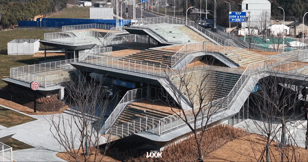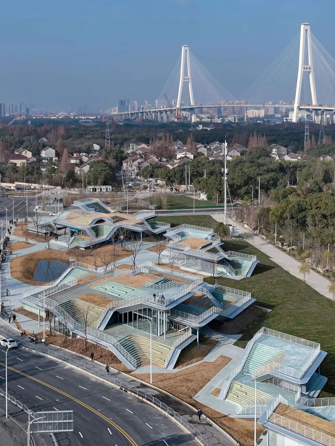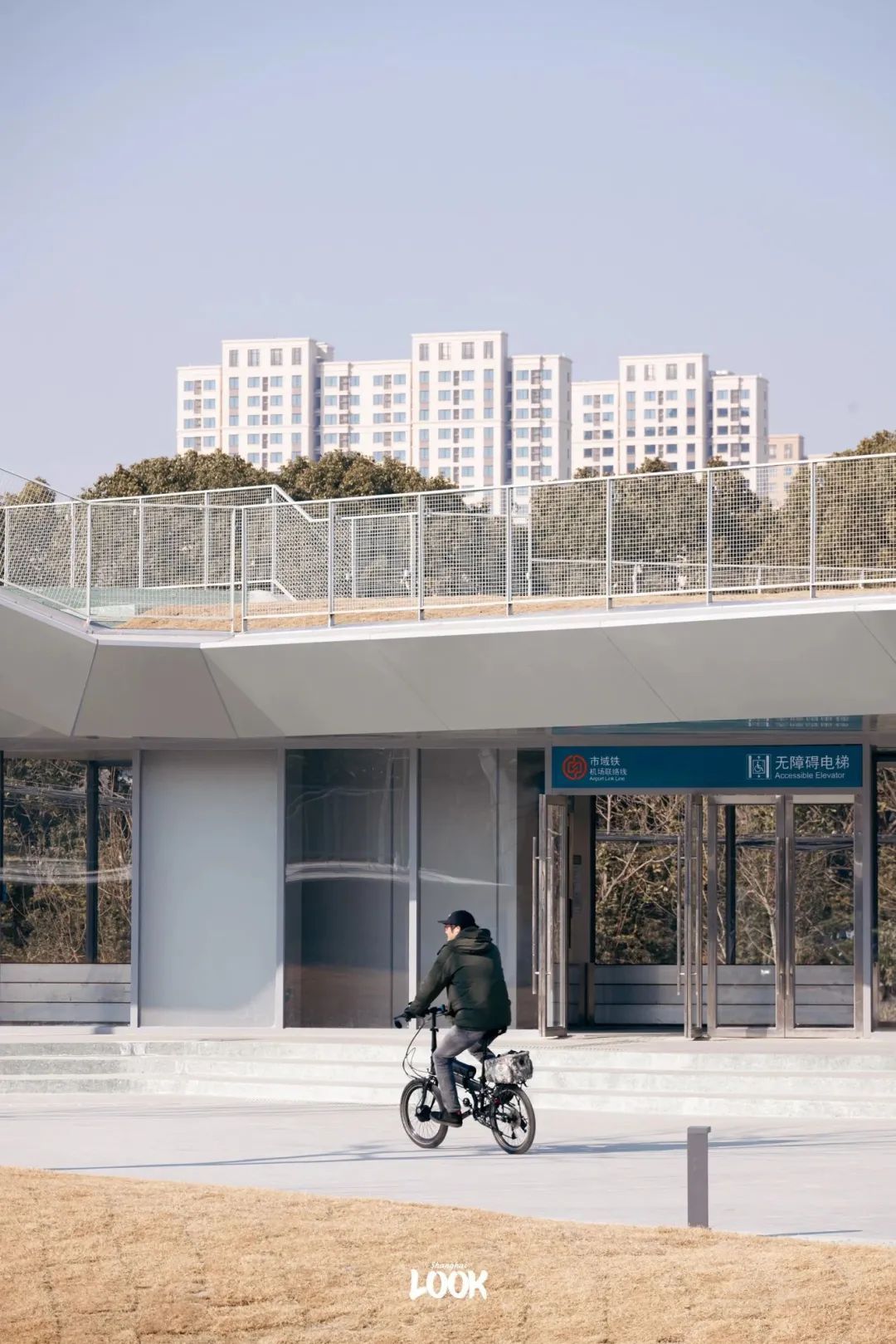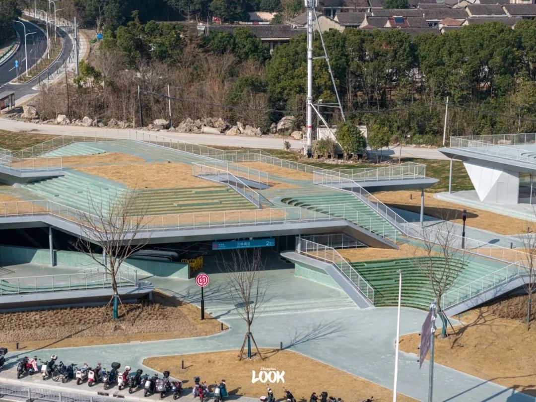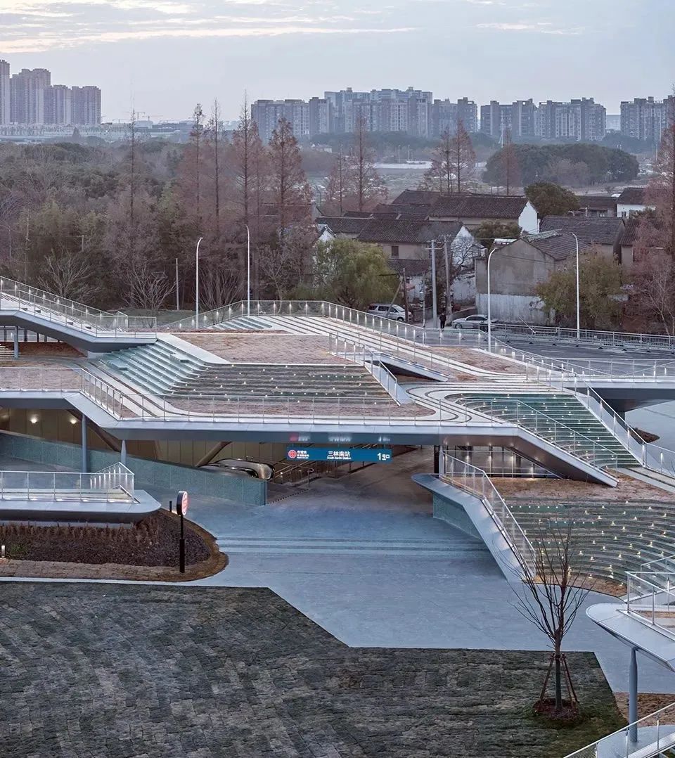 平坦开阔的大广场设计是多数车站的选择,但三林南站却反其道而行。它的站外景观特色十足,层层叠叠的阶梯构成数个连续延绵的立体浮岛,组合成独特的车站公园。(景观阶梯都在二层平台,不影响行人在一层出站)