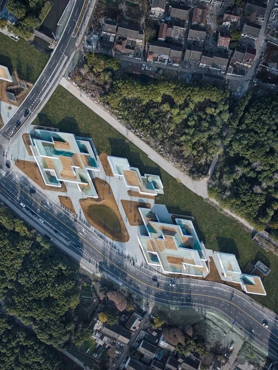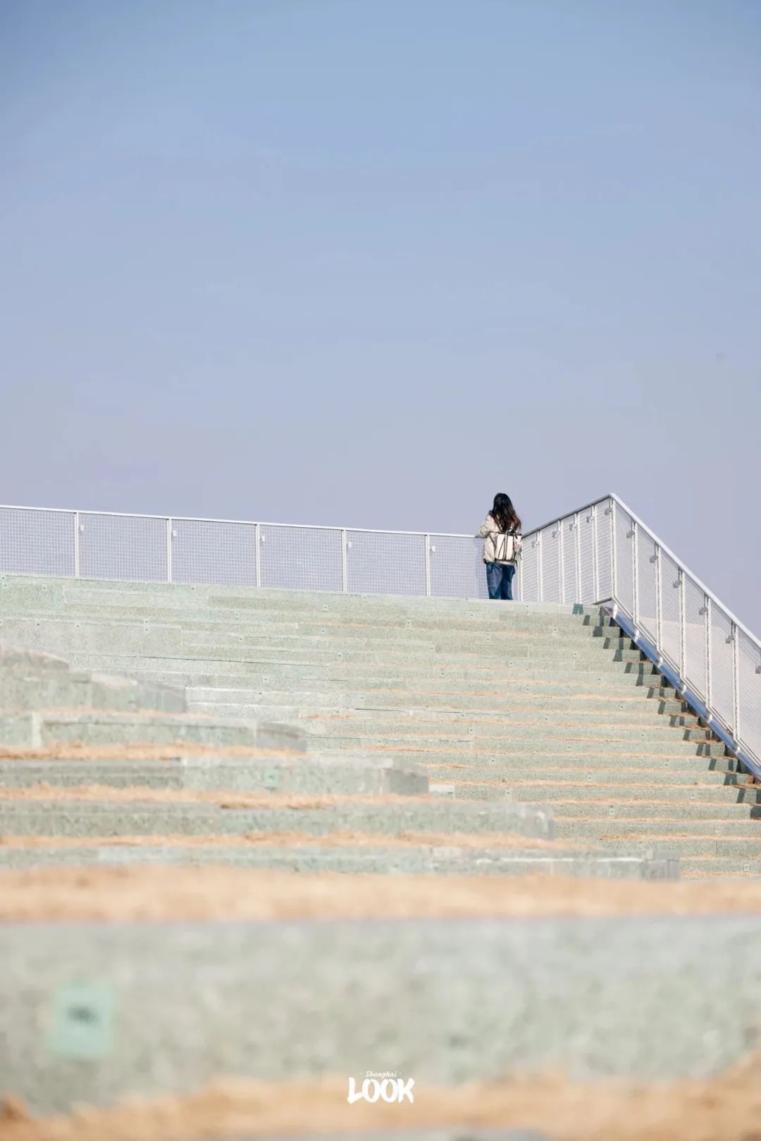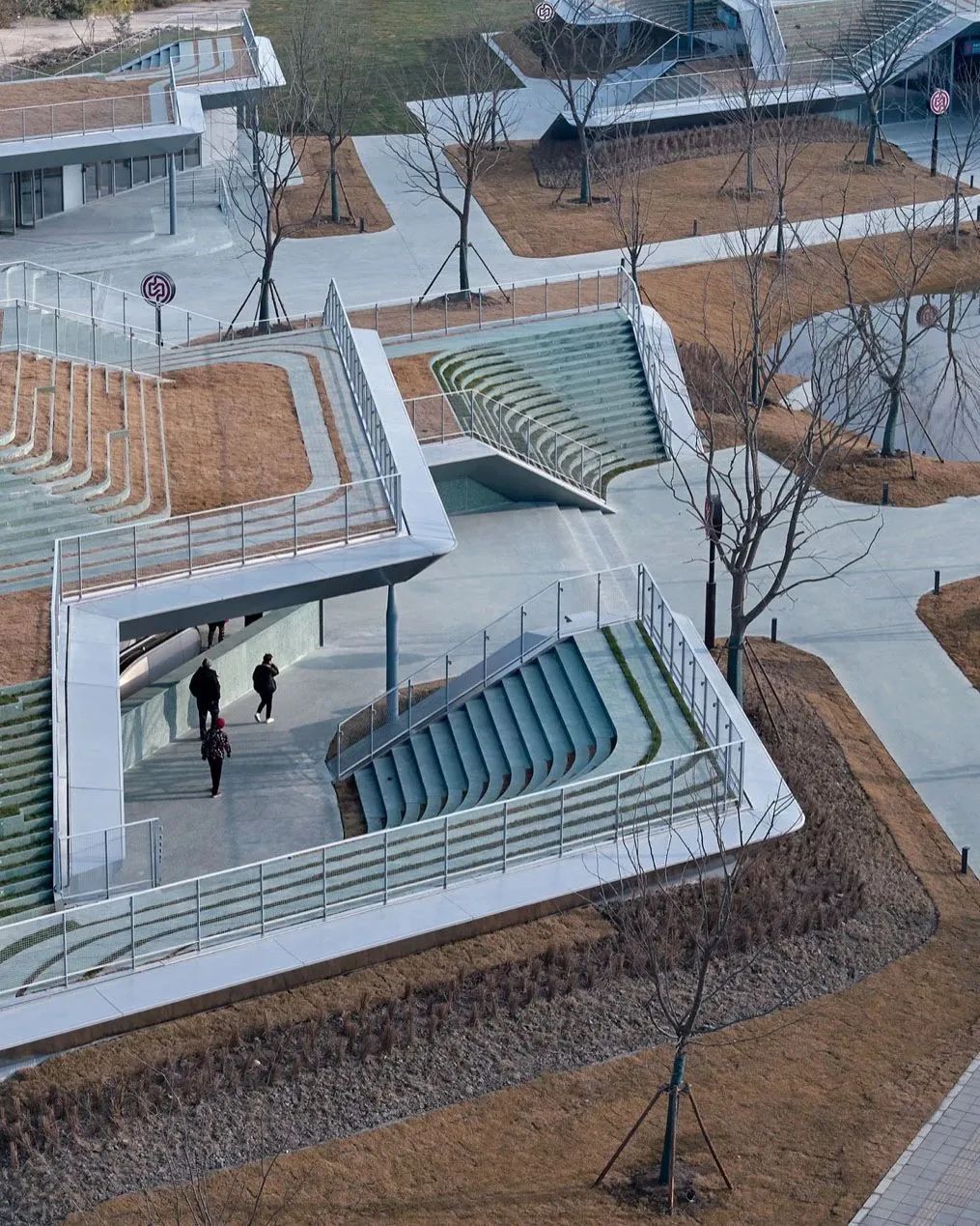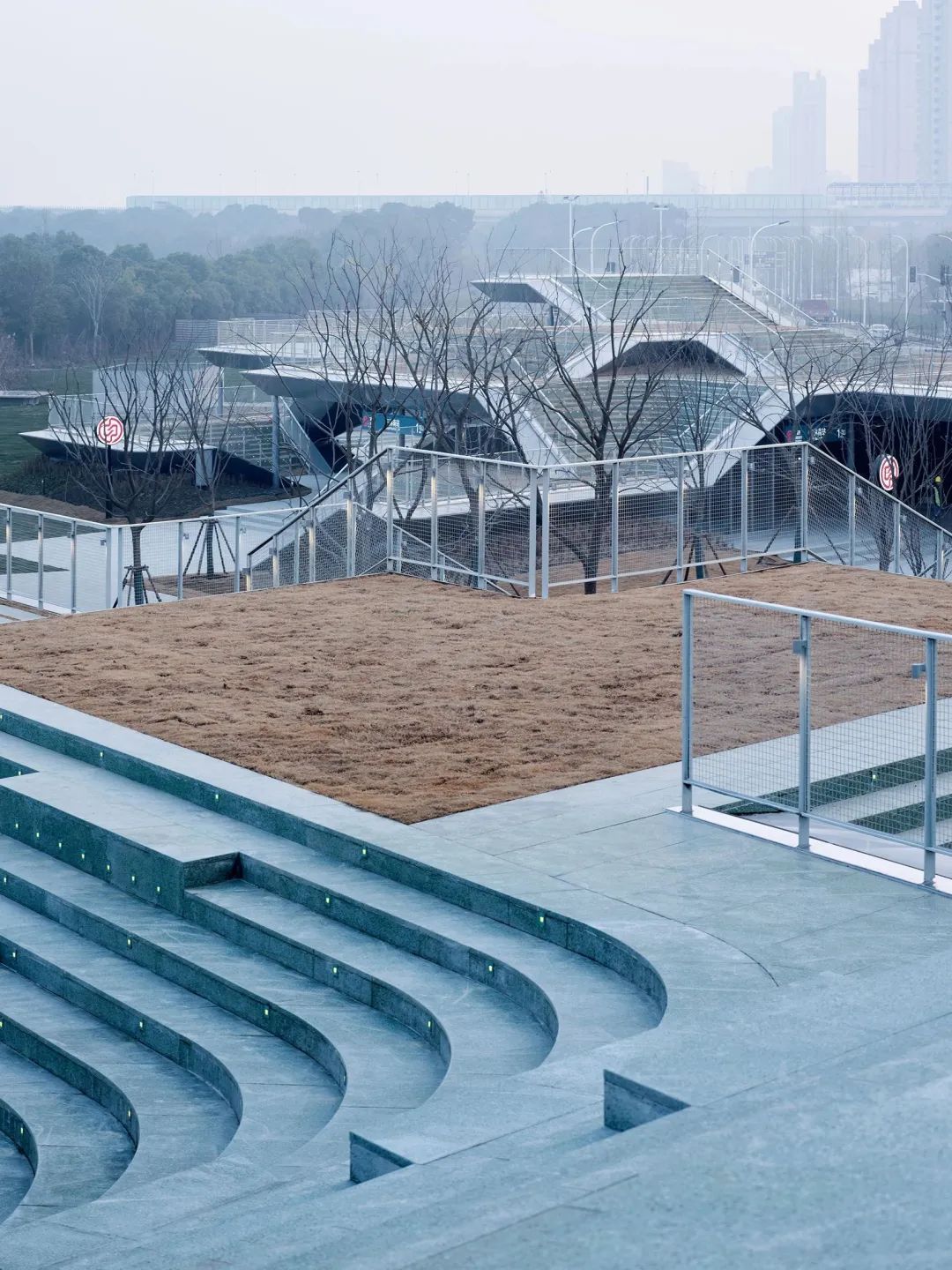 浅绿是它的底色;交错菱形组成它身体的“鳞片”;高低错落的楼梯,是它的景观台。它就像是个“梯田公园”,等到春天回暖草皮变绿,会是另一幅生机勃勃的景象。