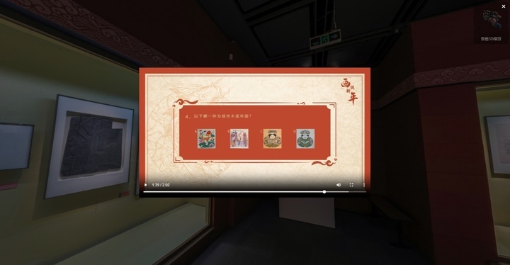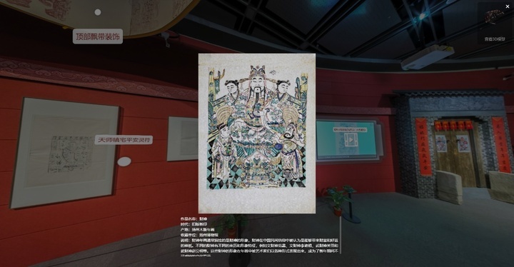 展厅的每一处细节都在虚拟展览中全方位记录。本次VR展览的共计三十六个点位全景点位涵盖展厅各个角落,涵盖木版年画展示区、历史介绍区及互动体验区等,包括“和气致祥”“天仙送子”“众仙献寿”在内的每一件年画展品都经过高精度建模,细节清晰可见。观众可在虚拟展厅中自由穿梭,全方位欣赏木版年画的精美细节,感受传统文化的独特魅力。