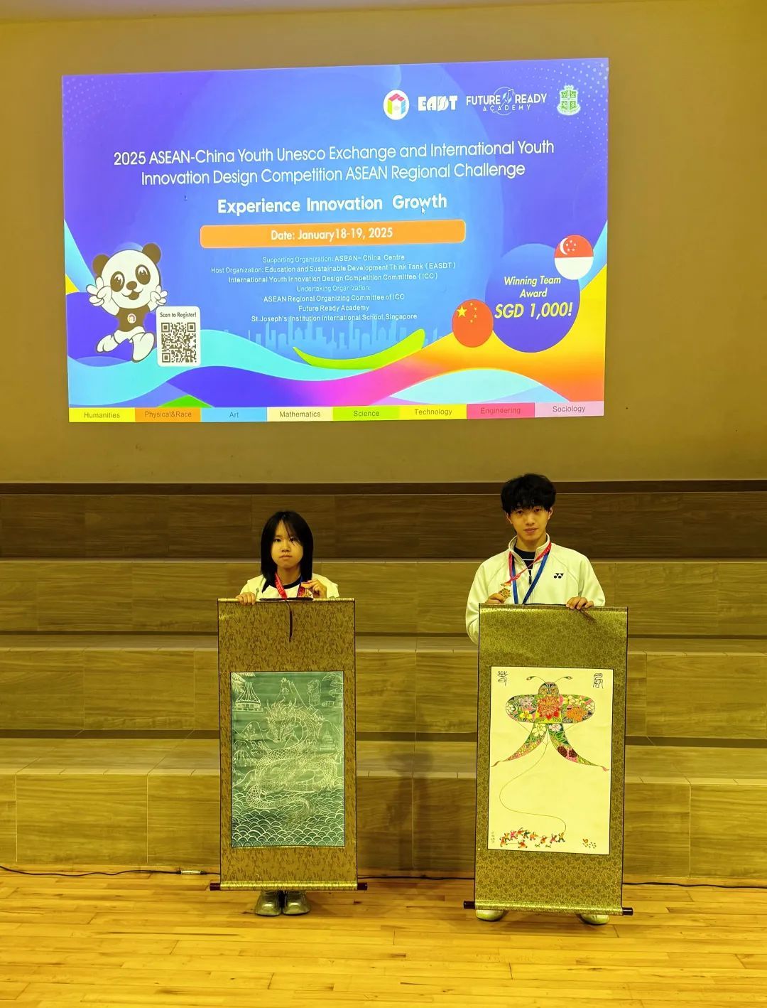 在此前进行的“2025中国-东盟青少年教科文交流暨国际青少年创新设计大赛东盟赛区挑战赛”中,《和合共生》获得创意作品金奖,学生宋智超的作品《盛世欢歌》、姚新雨的作品《逐风》获得创意绘画学生组金奖。