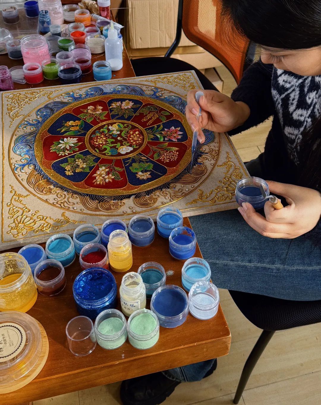 《和合共生》运用非遗技艺岩彩珐琅工艺,历经绘图、掐丝、点蓝、沥粉、贴金等十余道精细工序,用时两个月精心雕琢而成。画面巧妙融合中国与东盟十国文化元素,以东盟十国的代表性花卉纹样环绕代表中国的牡丹花纹,寓意着多元文化的共生交融。珍珠点缀的传统海浪纹,宛如一条文化纽带,象征着海上丝绸之路,见证着中国与东盟十国的历史交往和深厚友谊。