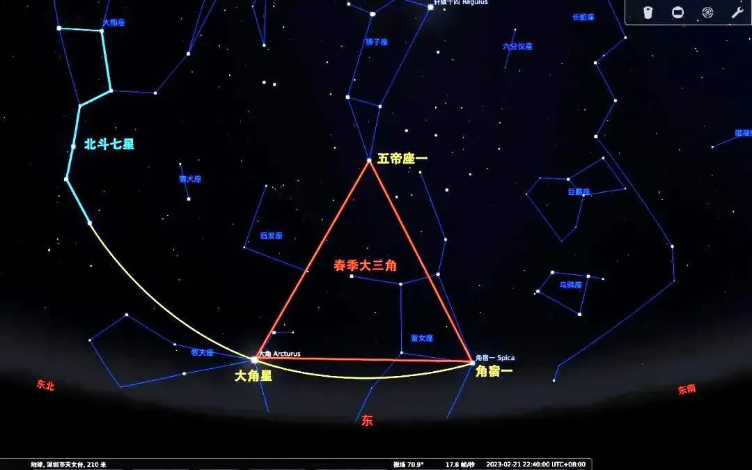 沿着北斗七星的勺柄曲线延伸,可以找到牧夫座α,我们一般称这颗星为“大角星”。