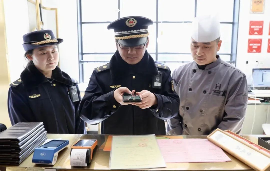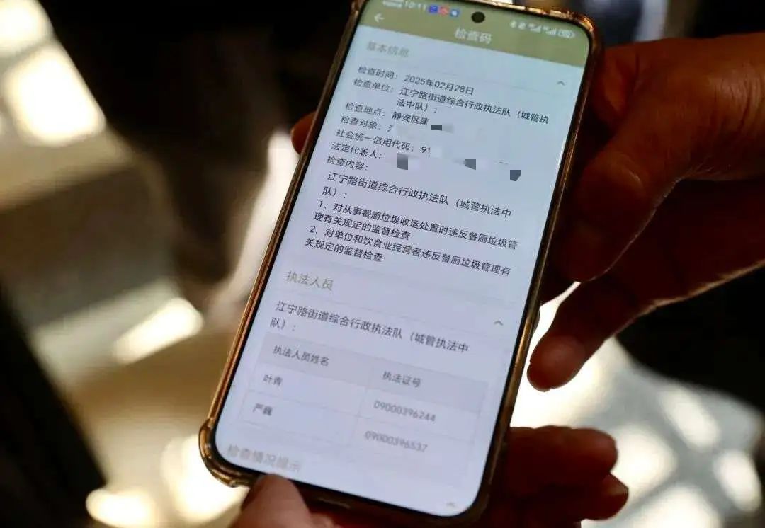 近日,综合行政执法队队员前往江宁路街道康定路上的一家餐饮店,履行行政检查职责。到达经营场所后,队员在手机上登录“双随机检查”模块,随后对应找到所检查的餐饮店,点击“已到达现场开始检查”,相应“检查码”便瞬时生成,餐饮店相关负责人随后使用本人“随申办”App扫描“检查码”后,检查对象、执法人员信息、检查内容等信息随即出现在手机界面上,一系列流程实现“码”上可见。同时,企业可通过扫码清晰了解检查的部门、人员、事项等信息,实现了执法过程的全透明化。