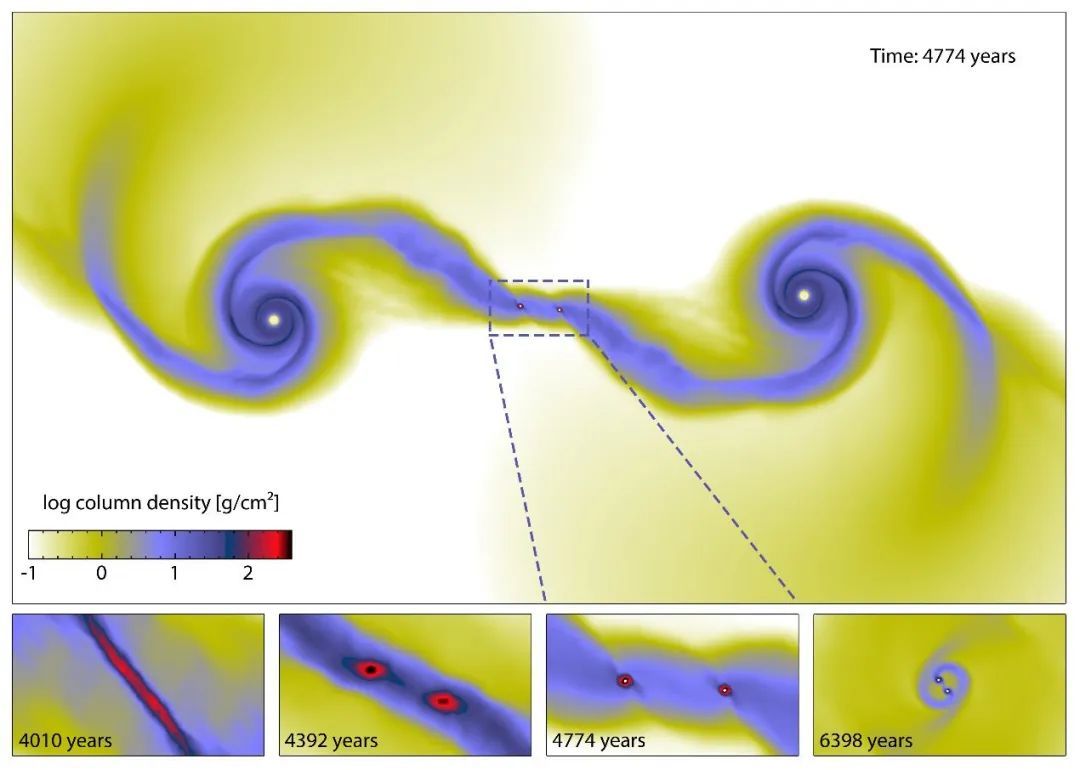 相遇星周盘之间形成潮汐桥并坍缩形成PMO双星的三维流体力学模拟示例