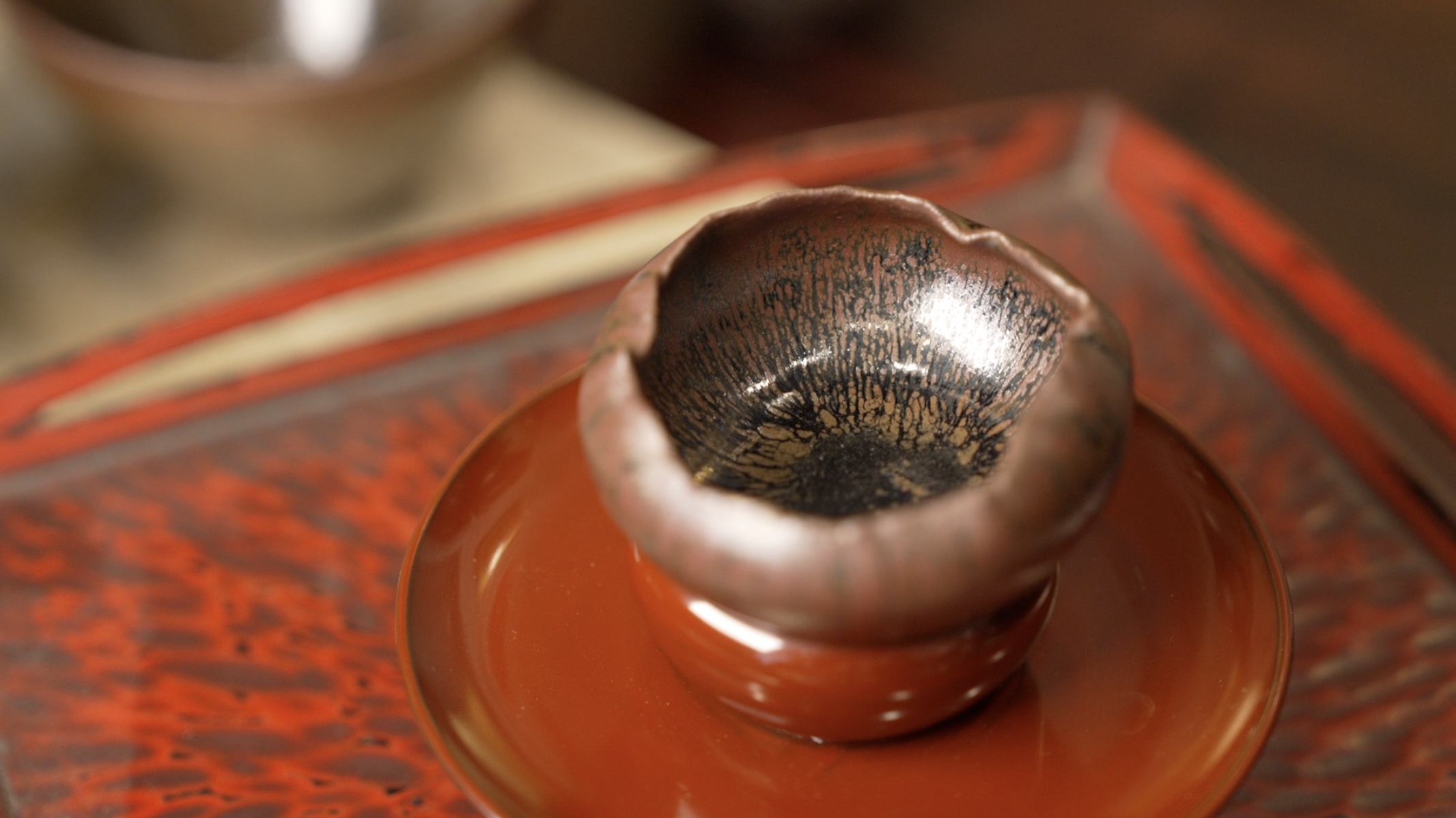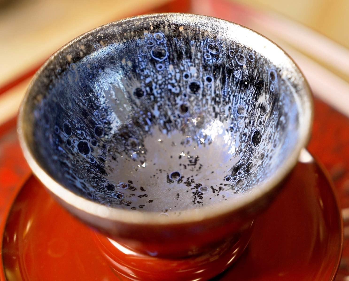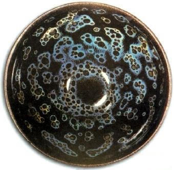 建盏的独特之处首先体现在其釉色上。建盏以铁系结晶釉著称,在高温烧制过程中,釉料发生复杂的化学反应,形成了变幻莫测、独一无二的斑纹。最为经典的当数兔毫纹,细长的丝状条纹犹如兔子身上的毫毛,在黑釉的衬托下,灵动飘逸,富有韵律。油滴纹则像点点油珠,均匀或错落有致地散布在釉面,在光线的照射下,闪烁着金属般的光泽,璀璨夺目。鹧鸪斑纹色彩斑斓,酷似鹧鸪鸟的羽毛,给人以自然、华丽之感。而最为神秘且珍稀的曜变纹,釉面上的斑点在光照下会呈现出蓝、紫、黄等多种色彩,仿佛蕴含着宇宙的奥秘,深邃而迷人。