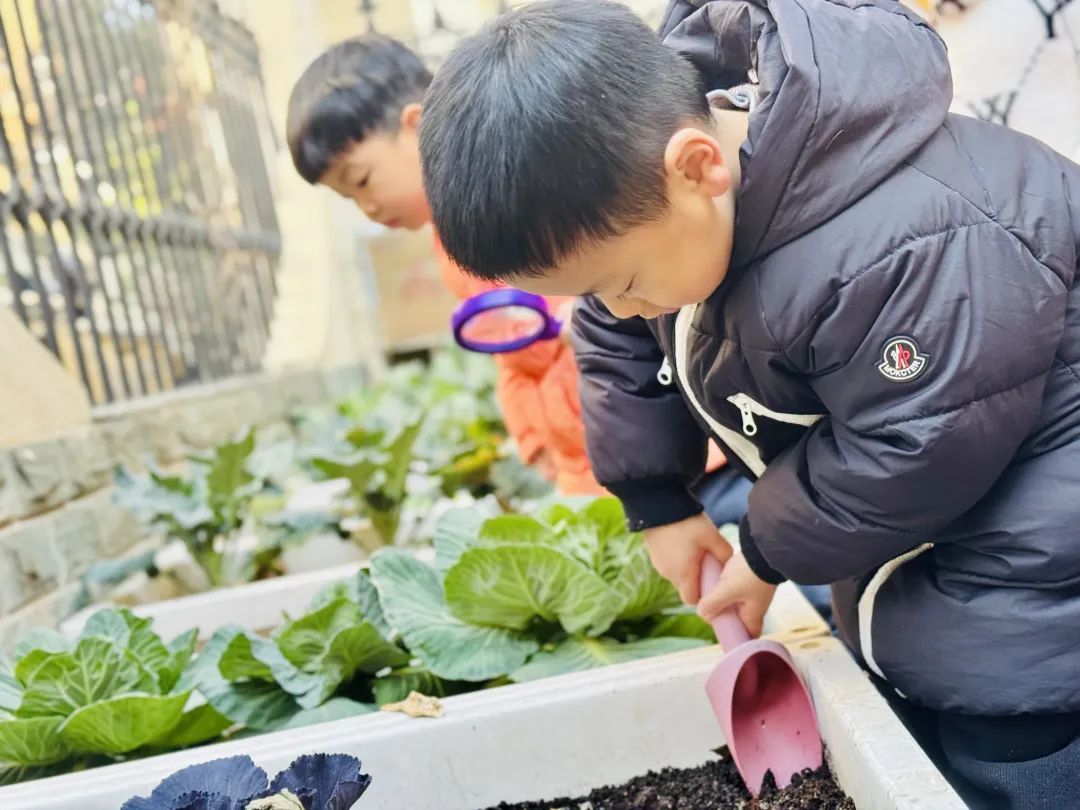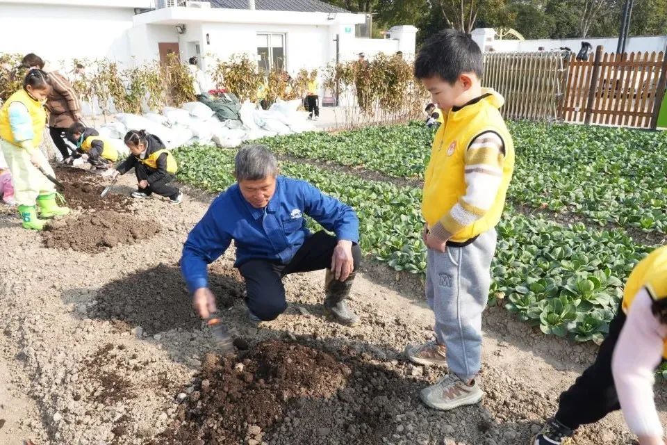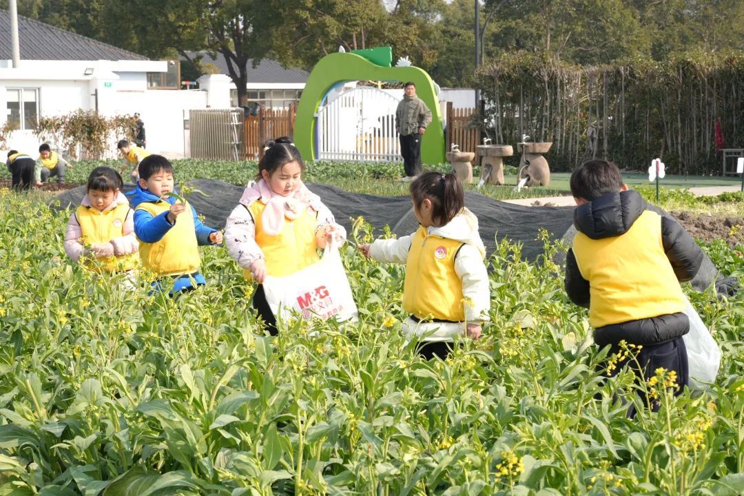 一来到现场,孩子们便欣喜不已,在老师的带领下迅速分组,拿上铲子、推车等工具进入田地施肥、采摘。有经验的村民和老师在旁指导劳作技巧、答疑解惑,满足孩子们的好奇心。“孩子们可以近距离接触自然,直观看到农民是如何耕种的,亲身体验耕种的艰辛,理解食物的来之不易。”小蜜蜂幼儿园园长钱雯卿说。