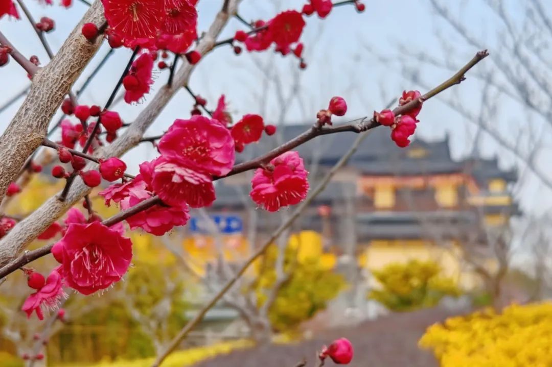 中新泾公园的梅花不算多,但是与这些建筑互相映衬,别具风格。游客可以在公园里感受:早春的暖意正在白墙与黄墙间流淌,梅香裹着禅寺的檀香、教堂的岁月沉香,酿成独属于中新泾公园的气息……
