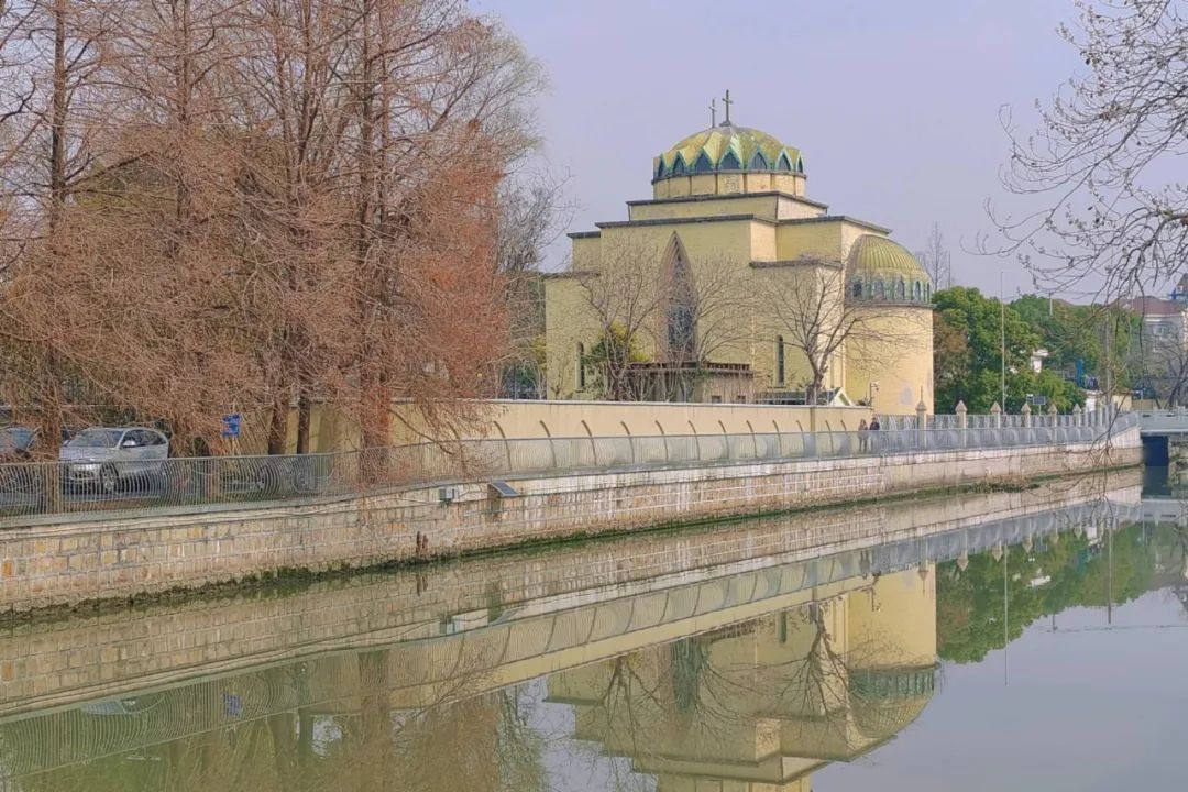 透过梅花,还能看到掩映在其后的禅寺黄墙,若隐若现,静谧而又充满禅意,在这样的景色里,仿佛时间都慢了下来。继续沿着步道向前,在河边就能看到拜占庭式穹顶正与东方飞檐遥相致意。这座占地仅2.6万平方米的公园,竟奇妙地容纳了三种文明的对话。
