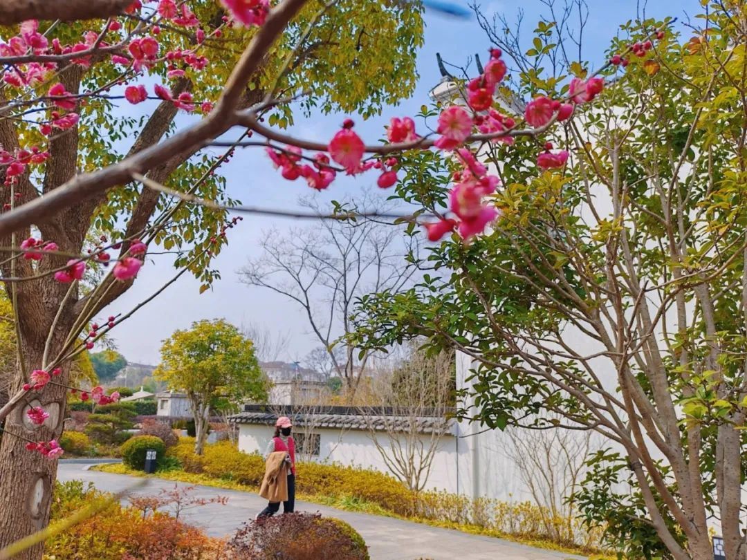 中新泾公园位于哈密路1233号,从上海动物园出发,沿哈密路步行十几分钟,便能踏入这片白墙黛瓦的徽派天地。作为申城稀有的徽派建筑群,公园内的马头墙在早春梅花的装点下,更显古朴清雅。