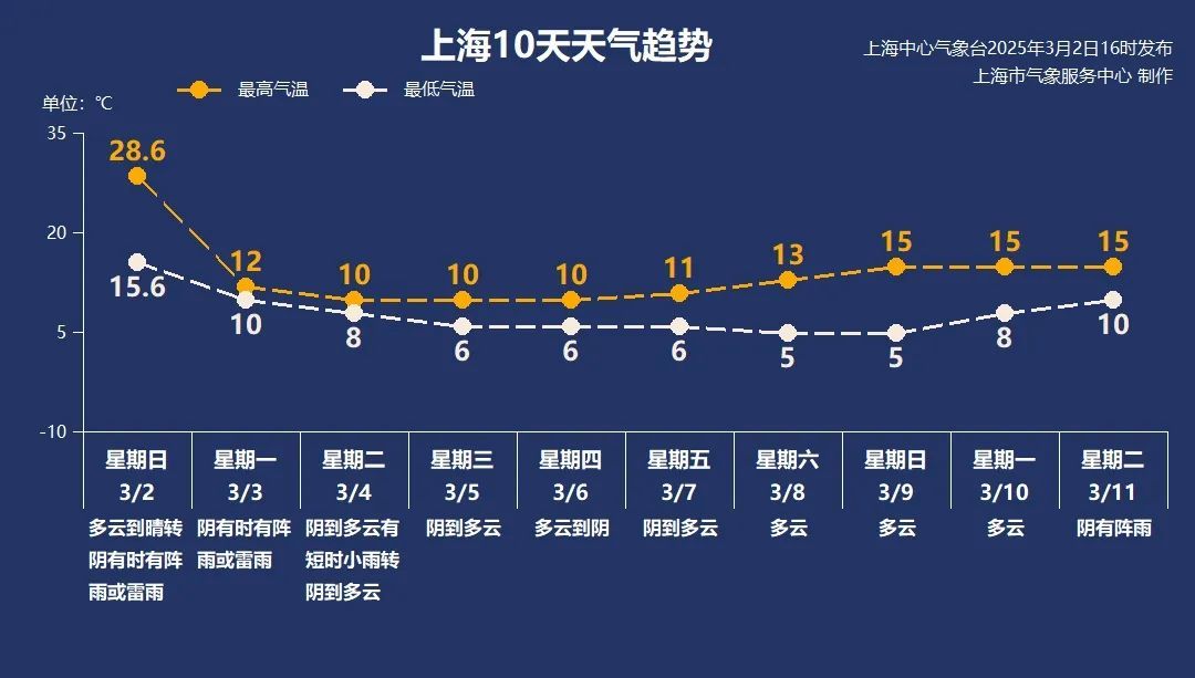本周先雨后晴,气温低位运行。冷空气控场后,周二雨水渐止,白天还有些短时小雨,之后转为阴或多云的天气为主。气温暂时难以明显回升,最低气温逐渐跌至5度上下,最高气温“1”字头,周后期随着南风再起,逐步回升至15度上下。冬春转换之际,天气乍暖还寒,请大家根据天气变化合理安排工作和生活。