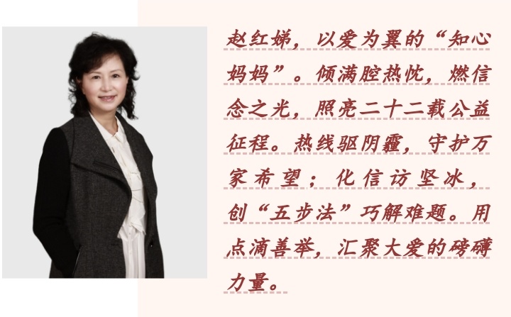 赵红娣致力于解决信访矛盾,12年中每年处理12个区的百余名信访对象的诉求。她既是团队领导者,也亲自参与一线工作,像“知心妈妈”一样,通过爱心陪伴、专业疏导和生活帮扶,解决了许多难题,挽救了多个家庭。例如,吕某因医患纠纷上访六年,赵红娣通过不懈努力帮助她平复情绪,出资近5万帮助其孩子治疗,最终吕某签署了化解协议,并表示愿意捐献眼角膜回报社会。赵红娣还总结了信访经验,创建了“五步法”,与专家合作出版了《调解心理学》,为解决社会矛盾提供了智慧。