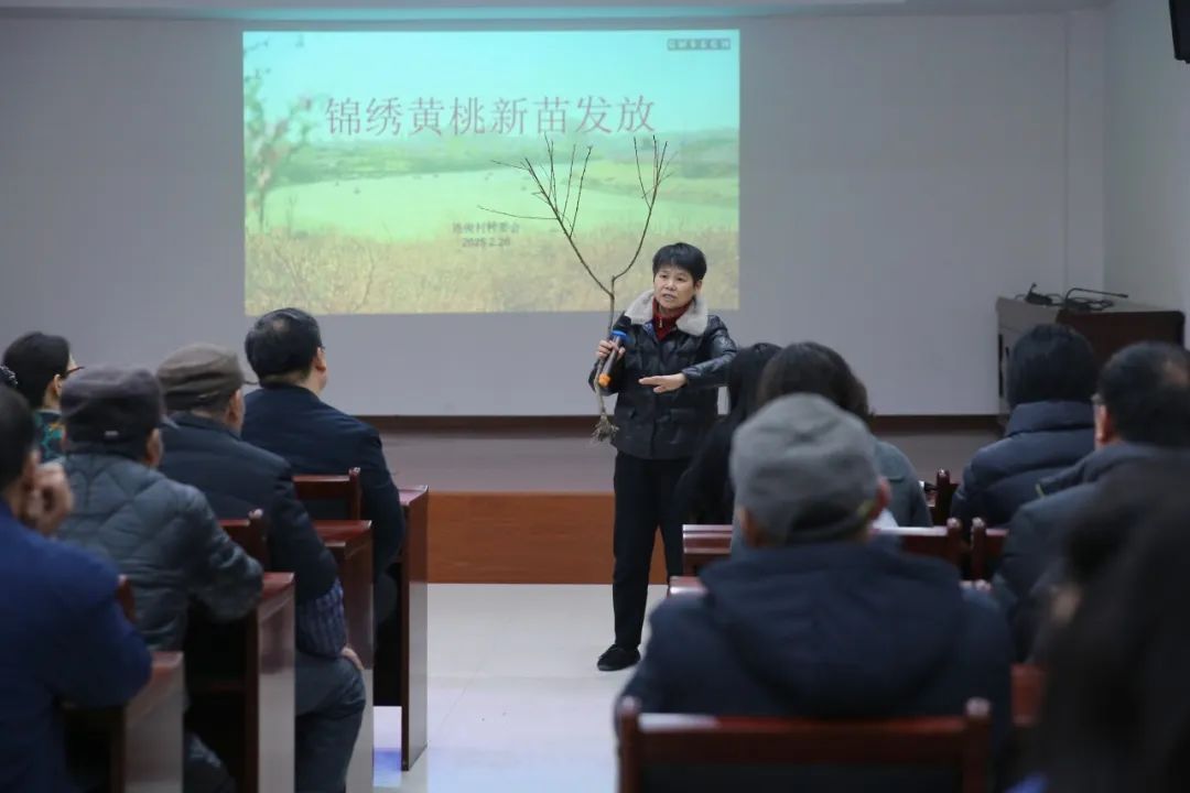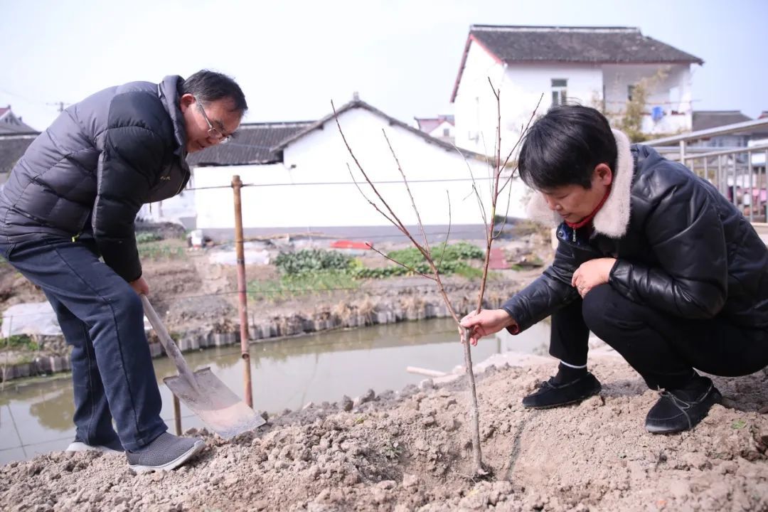 在连俊村,区农技中心的专家现场为村民传授“锦绣”黄桃的种植要点,涵盖树枝定型、土壤选择、灌溉施肥等方面。随后,专家走进村民家中,亲自示范从栽种到埋土的全过程,确保村民掌握正确的育苗方法。区农技中心高级农艺师管丽琴介绍,“锦绣”黄桃是上海市农科院培育的本土品种,此次发放的两年生双支树苗存活率更高,且适合宽行密植,可有效降低村民的管理难度与劳动强度。