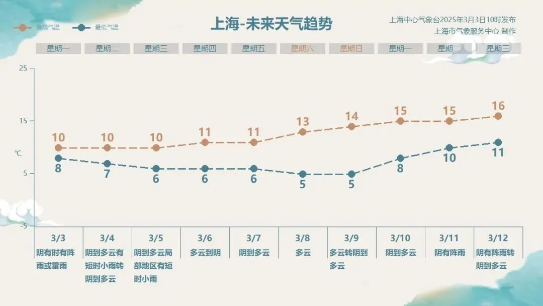 周二和周三受扩散南下冷空气影响,本市云系较多,偶有短时小雨。周四到下周初本市以多云天气为主。本周工作日气温较低,保持在6~11℃之间,双休日开始气温逐渐回升。