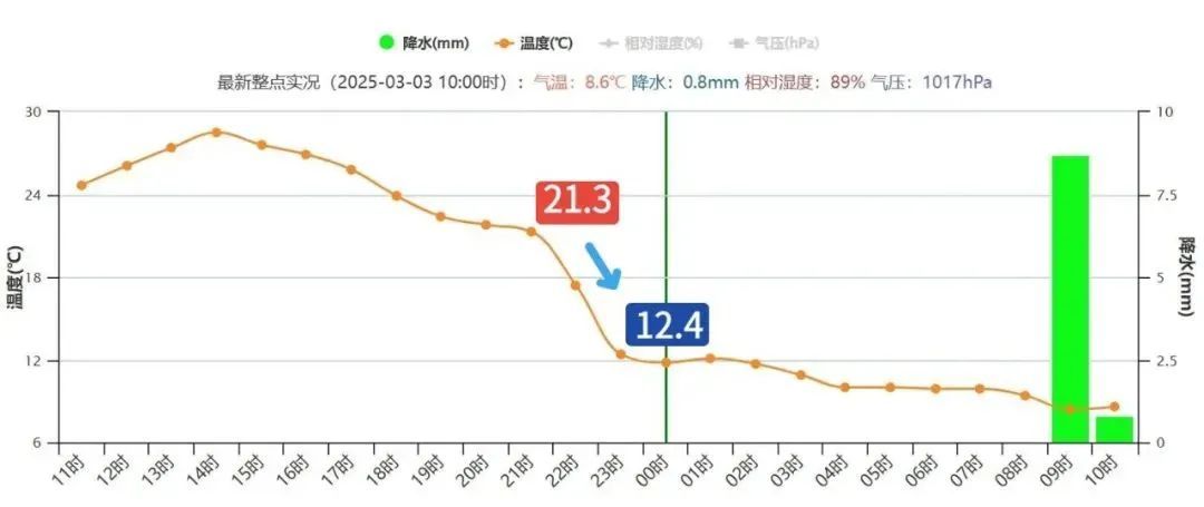 今天全天气温不高。昨天21时至23时2小时内气温狂跌近9℃,上午雨后气温在8~9℃,白天最高气温也就在10℃上下,请继续做好保暖和防风雨措施。