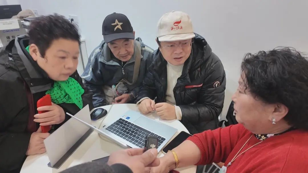 在活动现场,一间教室里正热闹地进行着短视频制作的教学。居民们围坐在老师周围,兴致勃勃地学习如何用手机里的照片和视频制作精美的短视频。老师耐心地讲解推、拉、摇、移等拍摄技巧,并一步步指导居民们实践操作。