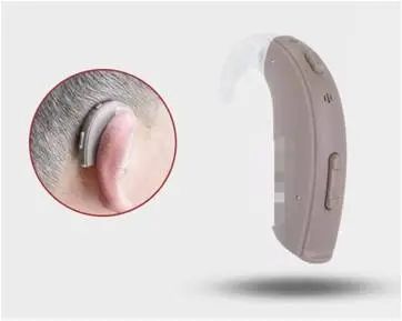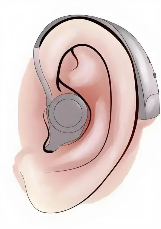 气导助听器通常使用喇叭发声,把声音导入耳内。气导助听器根据设计使用不同,通常又分为耳背式助听器和耳内式助听器。 ● 耳背式助听器 耳背式助听器主机挂在人耳上,受话器在助听器内部,通过耳钩将声音送入耳,优点是通用性较好,大部分人可以直接佩戴在耳朵上,还可将头发进行遮挡。