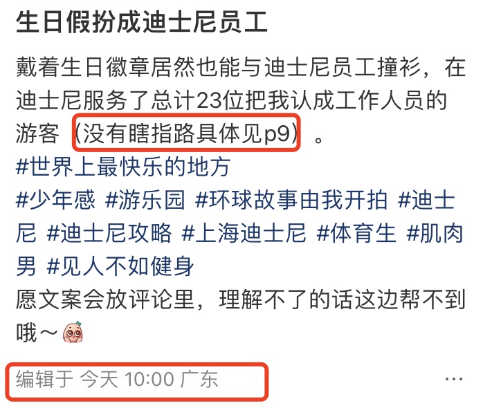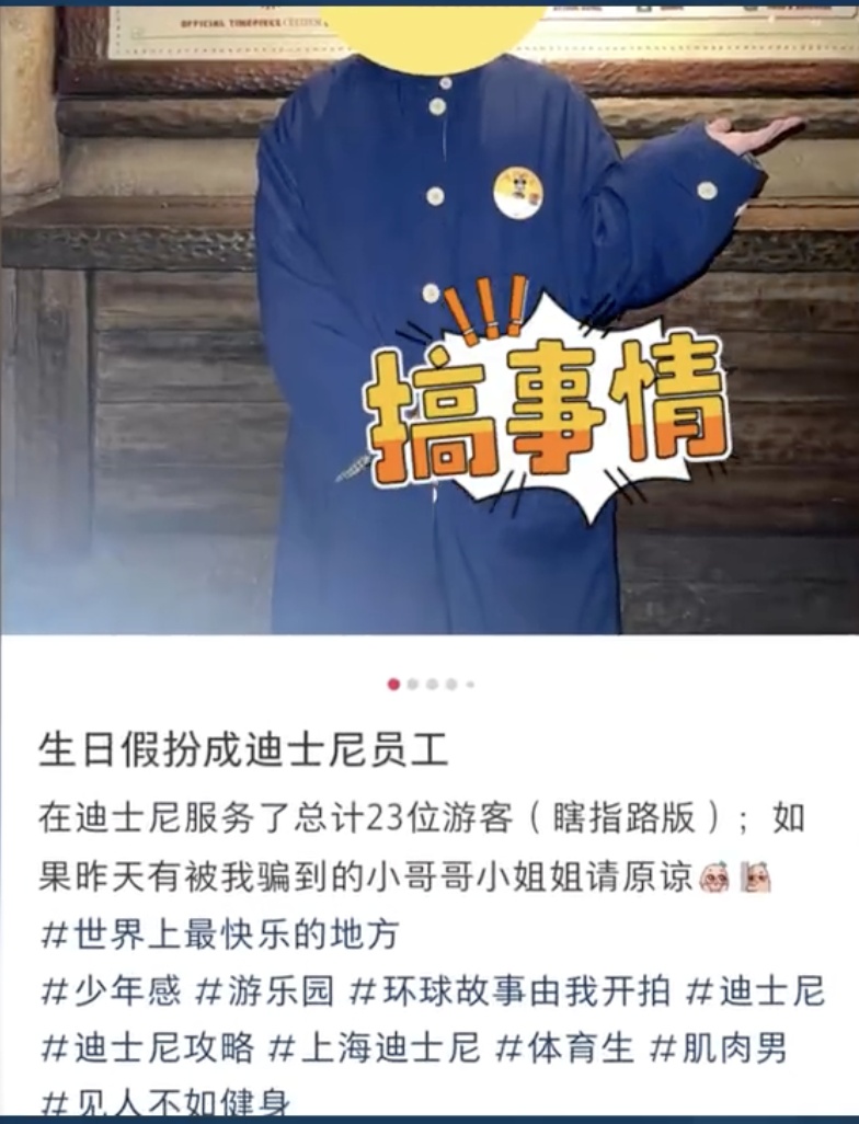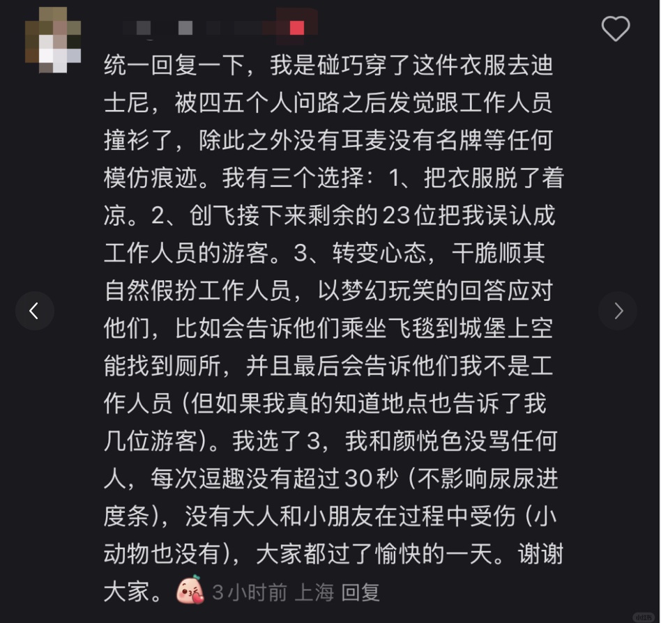 3月1日,一博主在社交平台发文称自己“生日假扮成迪士尼员工,服务了23位游客,甚至存在瞎指路情况,请求游客们的原谅”。