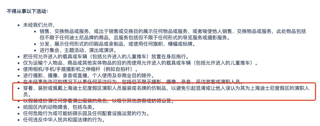 记者搜索发现,在上海迪士尼乐园游客须知中,明文规定不得从事以下活动:穿着、装扮或佩戴上海迪士尼度假区演职人员服装或名牌的仿制品,以避免引起混淆或让他人误认为其为上海迪士尼度假区的演职人员。