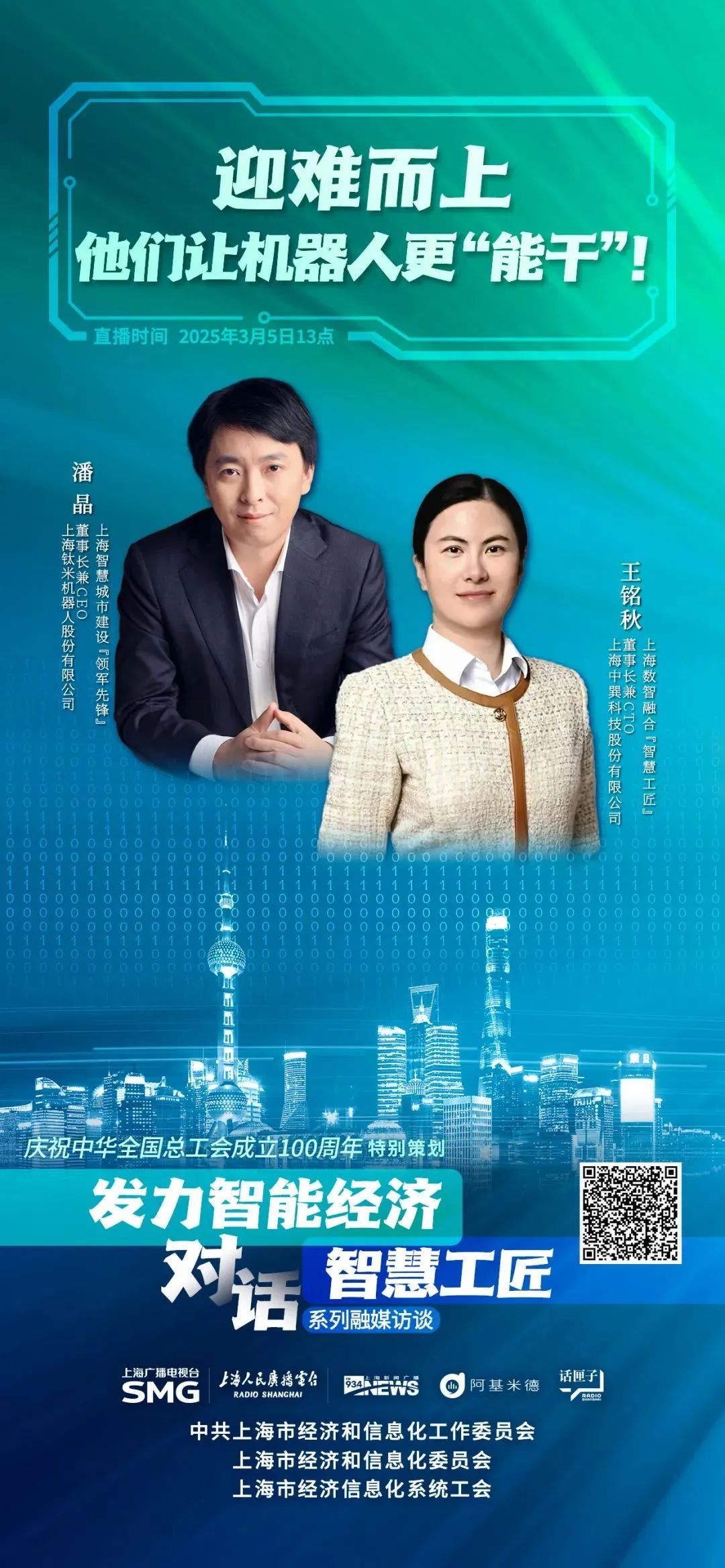 为庆祝中华全国总工会和上海总工会成立100周年,上海人民广播电台与上海市经信工作党委、上海市经济信息化委联合推出《发力智能经济 对话智慧工匠》系列报道和融媒访谈,展现智慧工匠们的成长经历,创新活力和引领示范作用。