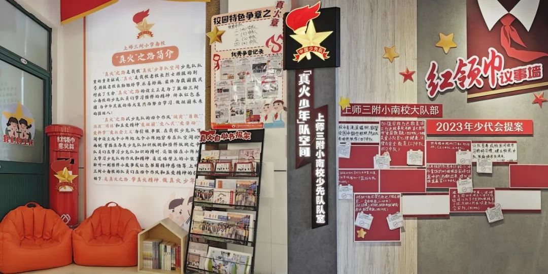 这是学校少先队活动和学习的空间,也是闵行区少先队示范队室。以老校长顾振烈士的别号“真火”为名,正是为了继承老校长传播红色精神的理想,队员们在这里学红色知识、传红色文化、践红色行动、走“真火之路”、做“真火少年”。