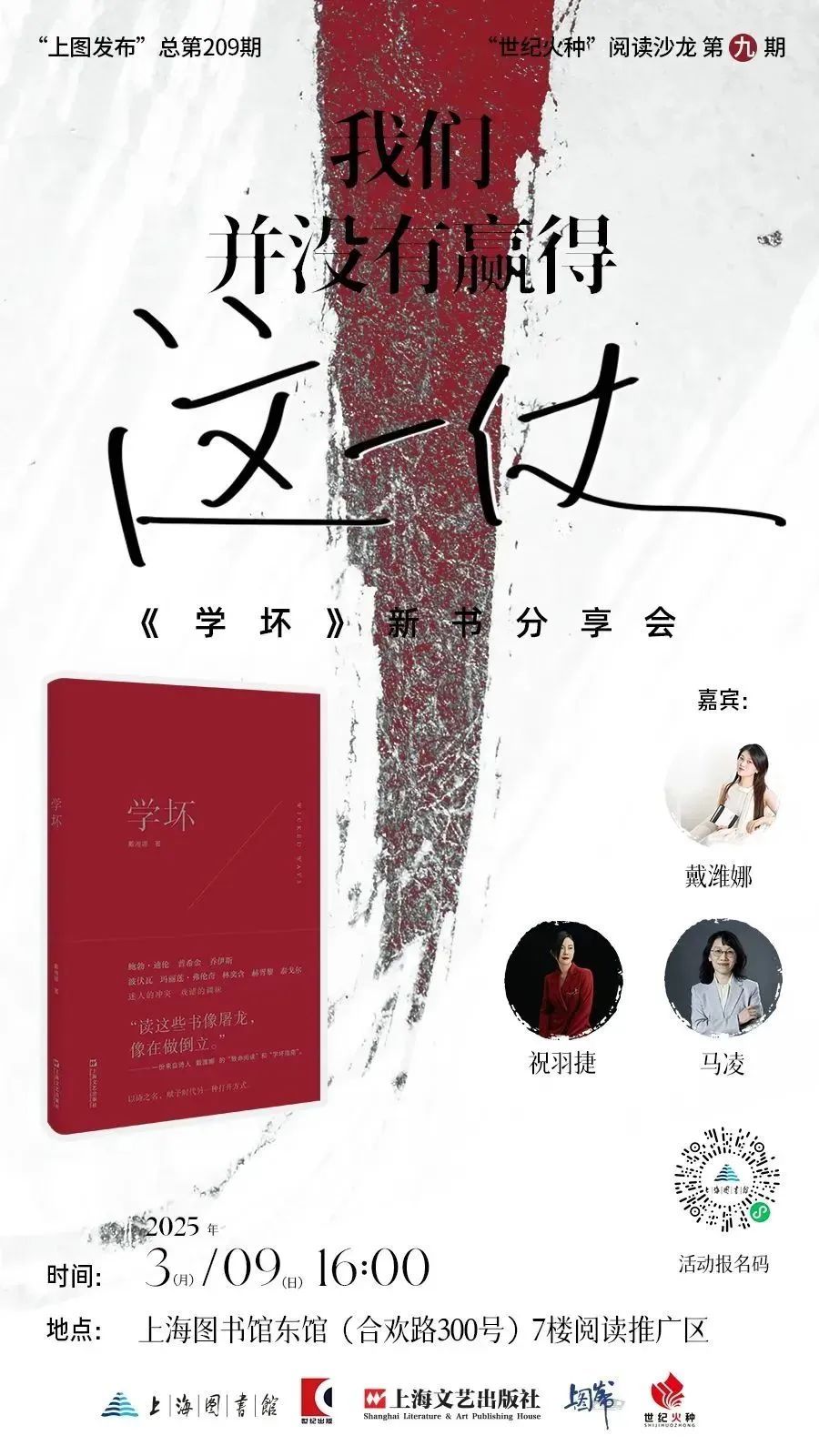 上图发布×世纪好书精选榜(第四期)发布会预计在3点结束,一个小时的转场后,我们将迎来“上图发布 | 我们并没有赢得这一仗——《学坏》新书分享会”,由上海文艺出版社推出的《学坏》也入选“上图发布×世纪好书”精选榜(第四期)。